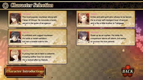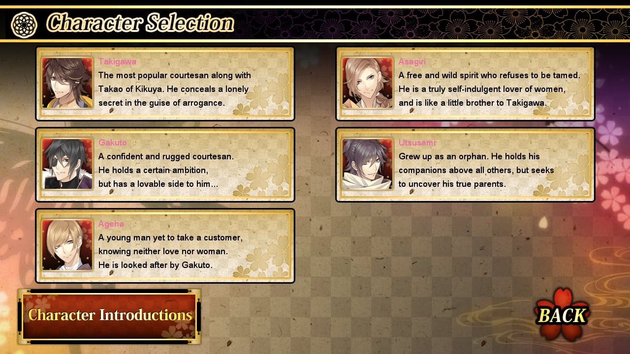 Во вселенной The Men of Yoshiwara: Ohgiya роли мужчин и женщин поменялись местами, поэтому предстоит осваиваться в совершенно непривычном мире, где социальные статусы и ценности перевернуты с ног на голову. Проходя нелинейную сюжетную историю, девушка сможет познакомиться с парнями, выполняющими работу куртизанок. На выбор будет доступно построение отношений или любовные утехи с Такигавой, Асагари, Гакуто, Утусеми и Агехой.