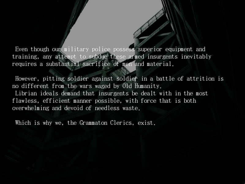 Jouka no Monshou - Emblem of the Sacred Flame показывает мрачный сеттинг будущего, где человечество сталкивается с масштабной катастрофой, происходящей впоследствии Третьей мировой войны. Мир стоит на пороге разрушения, где власть захватывает жестокая и деспотичная организация, устанавливающая свои порядки. Геймеры оказываются в научно-фантастической антиутопии, где над людьми установлен жестокий контроль при помощи одной системы, устраняющей культурные ценности, что вызывают эмоции у субъектов. Игра выполнена в виде интерактивной визуальной новеллы, где от каждого действия геймеров будет зависеть развитие происходящих событий.