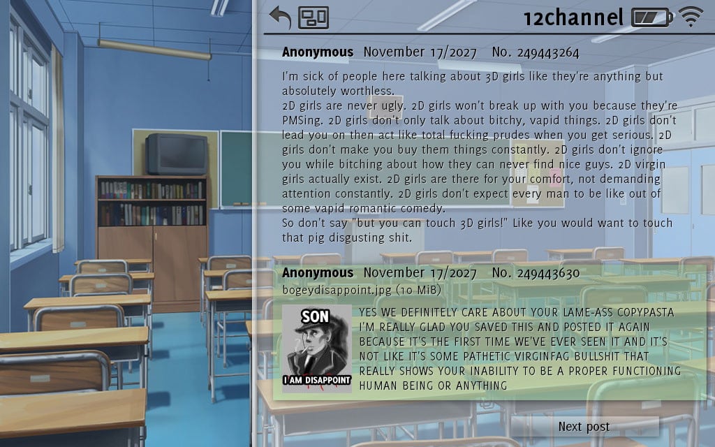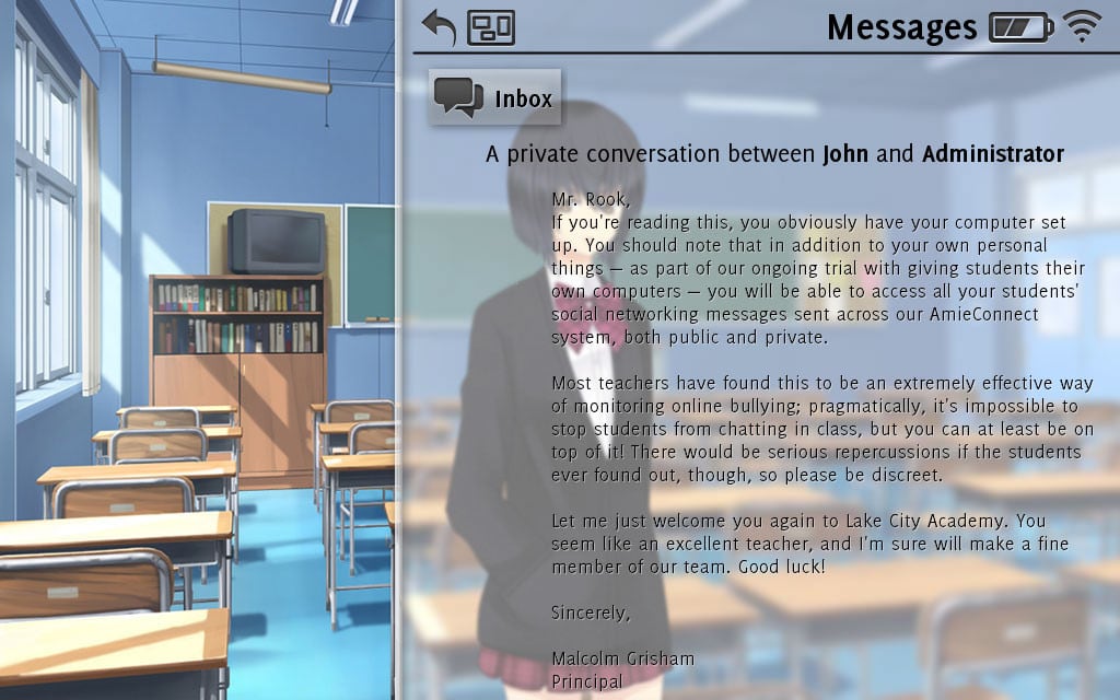 Don't take it personally, babe, it just ain't your story погружает пользователей в визуальный роман, позволяющий интерактивно взаимодействовать с окружающей средой и другими персонажами. Игроки будут наблюдать за историей одного преподавателя, обучающего детей в школе. От лица героя придется наблюдать за развитием сюжета, в котором примут участие другие учителя и школьники, что будут выяснять свои отношения на глазах у протагониста. Игра позволяет совершать выборы и направлять действия учителя, что старается просто добросовестно вести занятия и устранять конфликты между детьми.