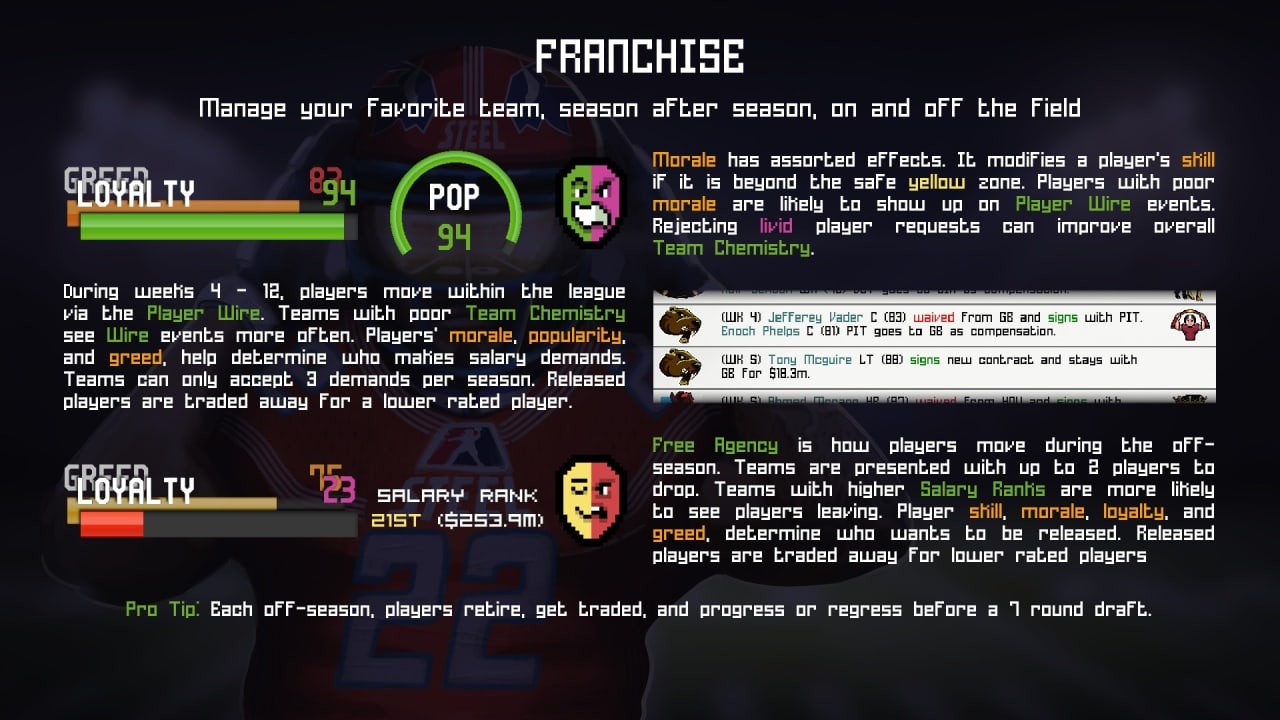 Погружение в Legend Bowl выполнено в форме гибридного аркадного футбола-регби и симулятора, в котором пользователям приходится заниматься полноценной настройкой команды, а потом отправляться на соревновательные матчи против других клубов. Игра позволяет подобрать желаемых спортсменов и создать уникальный футбольный клуб, в котором придется заниматься с игроками и тренировать их. Геймеры будут наслаждаться пиксельной графикой, позволяющей погрузиться во времена олдскульных проектов.