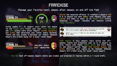 Продвигаясь по одной из выбранных сезонных лиг, предстоит пройти 17-недельное расписание из матчей, где придется отслеживать за полноценной статистикой игроков, а также наблюдать за еженедельными новостями и итоговыми результатами других футбольных команд. Пользователи могут выбирать между 16 предложенными клубами, чтобы отправиться на чемпионат за кубок мира, сражаясь со своими соперниками на поле.