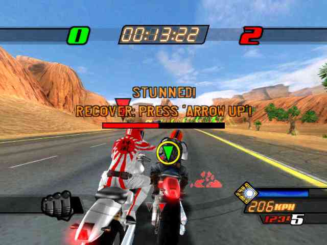 Соревнования наполнены динамичными сценами, раскрывающимися через схватки на дорогах. Протагонист получает возможность бить противников битой в ближнем бою, находясь рядом с мотоциклом оппонента или бросать коктейли Молотова, поджигая участки на дороге и взрывая врага. Для атак на расстоянии получится применять двуствольное ружье, а также можно столкнуть гонщика с байка и перехватить его транспорт. Главной задачей для геймера становится добраться как можно быстрее до финиша.