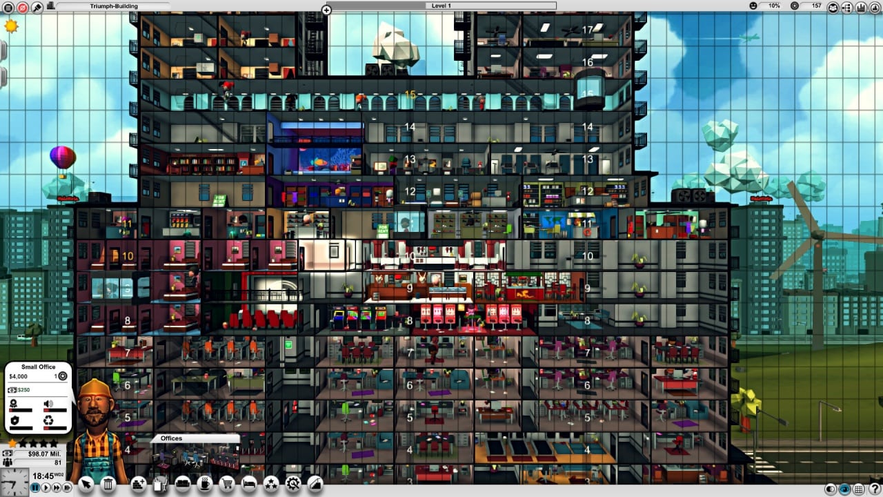 Отдельного внимания в игре стоит система лифтов, в которой имеется масса настроек. Здесь можно уменьшить время ожидания, и даже пропускать ненужные этажи. В симуляторе также есть масса непредсказуемых событий, например, есть недовольные арендаторы, случаются пожары, землетрясения, и даже похищения НЛО. С ними в процессе предстоит научиться бороться и преодолевать.