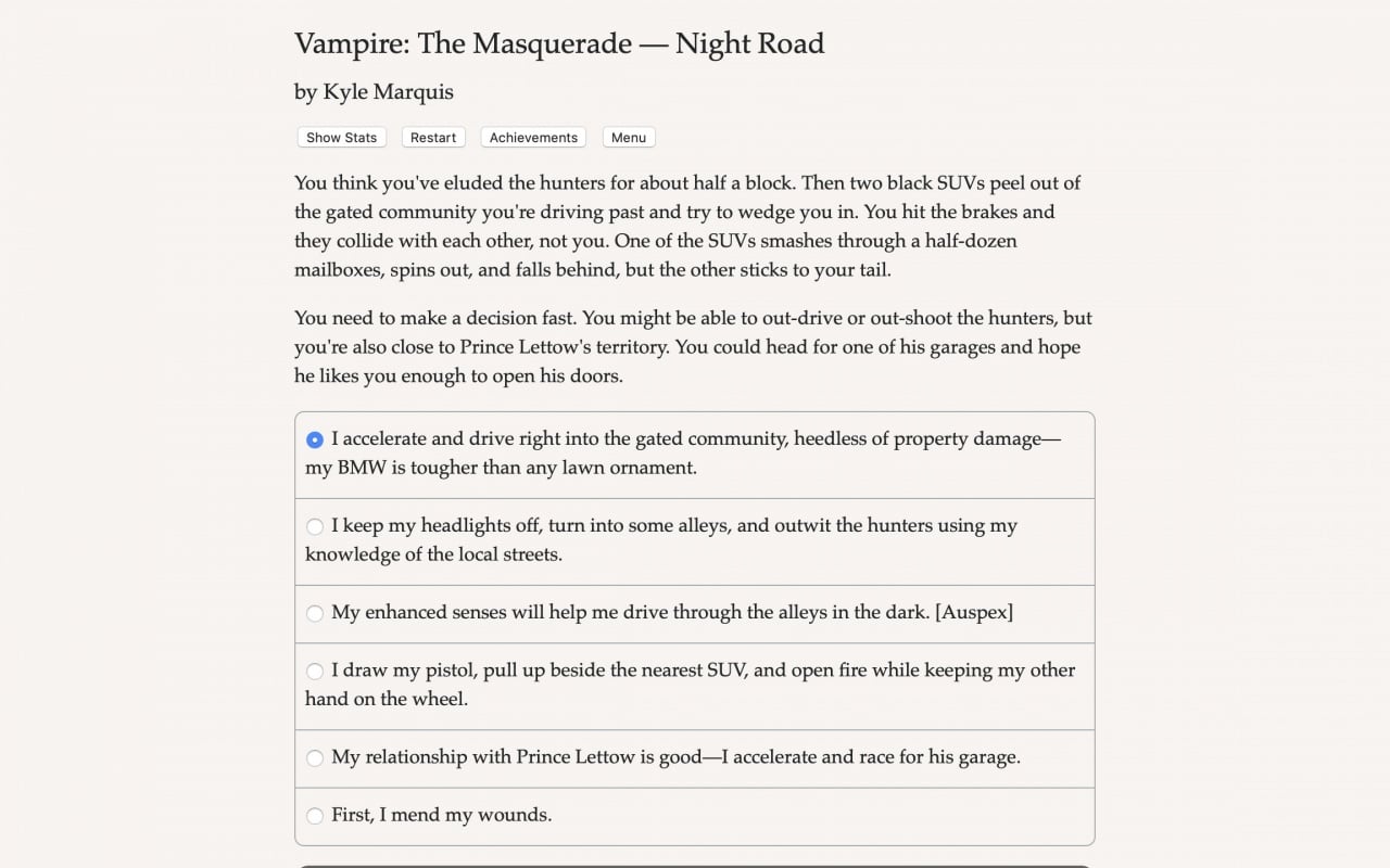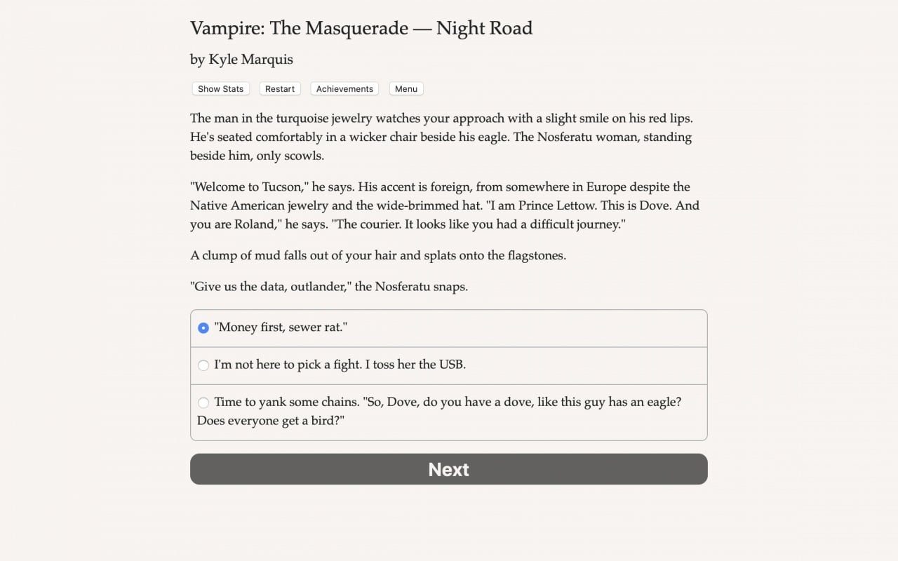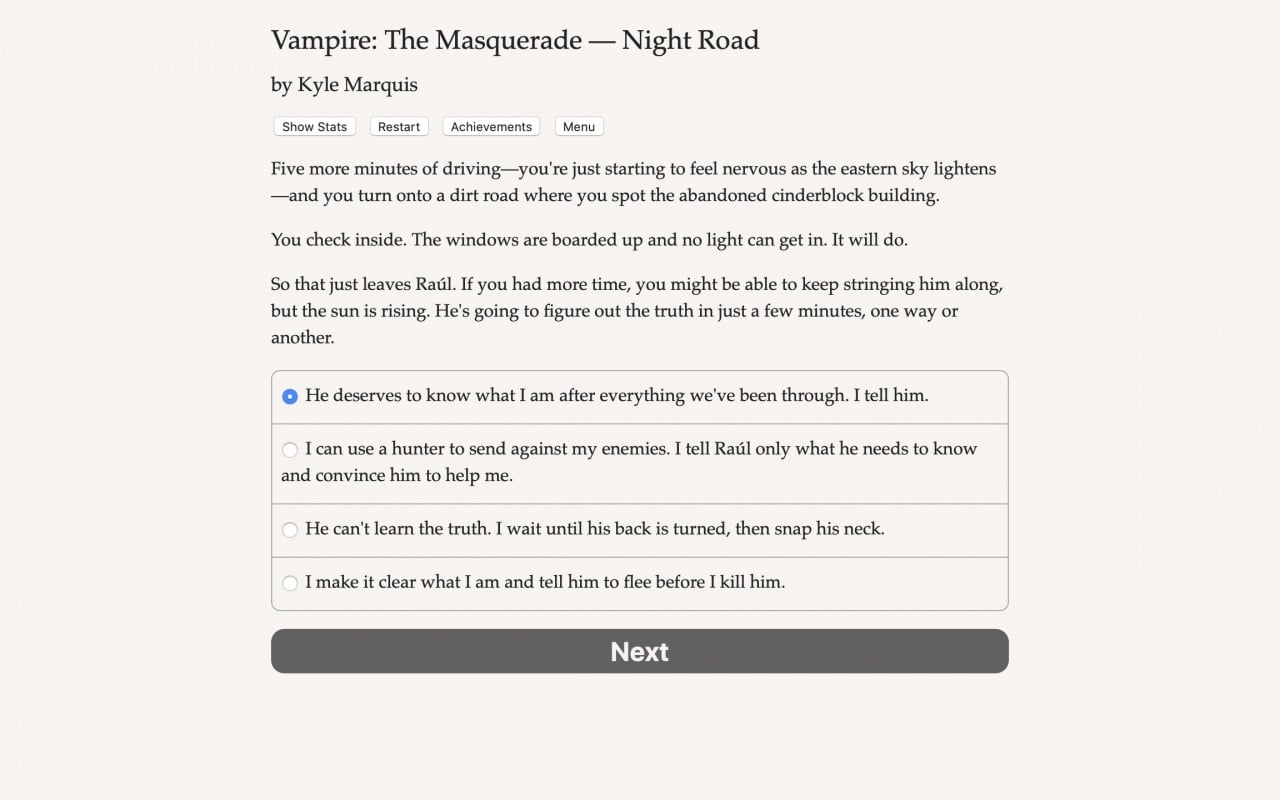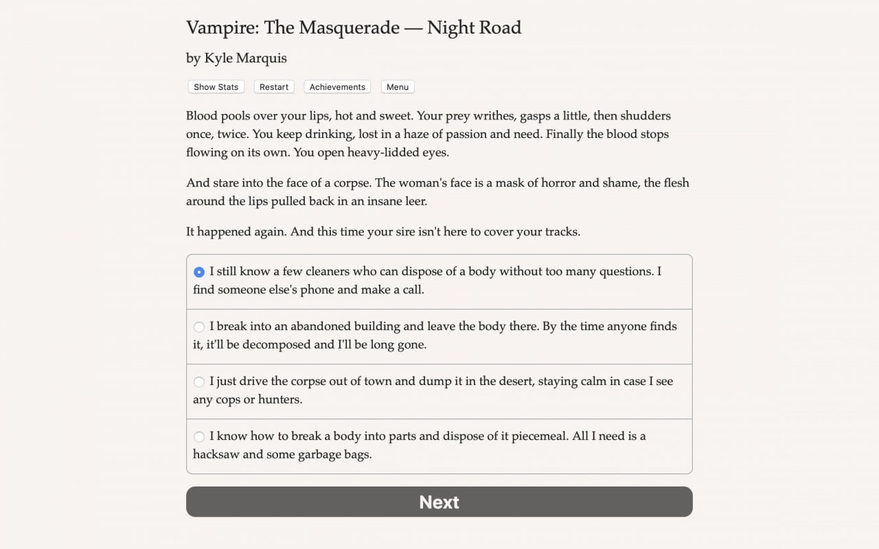 Vampire: The Masquerade - Night Road RUS v Build 17814894 Новая версия Полная версия Последняя в альт. раздачах Дата выхода 24 сен. 2020 Разработчик Choice of Games Жанр RPG, Приключения, Инди Очень положительные на основе 673 обзоров в Steam 90% Обновлено 19 мая 2025, 06:08 Список изменений Став элитным курьером -вампиром в Vampire: The Masquerade — Night Road предстоит передать секреты старейшин в нужные руки до того, как взойдет солнце, или кто-то из охотников отнимет ценный груз. Художественный стиль, представленный только текстом, нет ни визуальных ни музыкальных аспектов. Картинка происходящего ограничивается фантазией и воображением игрока. Одно прохождение занимает до 10 часов, есть все предпосылки для повторной пробежки, чтобы раскрыть новые диалоги, события и персонажей. Всё повествование Vampire: The Masquerade — Night Road вращается вокруг аморальных, кровожадных и саморазрушительных вампиров. Всего представлено: вводная глава, три раздела и грандиозный финал. Каждый раздел содержит три пункта назначения в любом порядке, с перерывами между миссиями, что используются для улучшения способностей, прокачки инструментов, покупки убежища, лечения ран, утоления жажды или выполнения дополнительных квестов, для получения большего количества валюты. Геймплейно это визуальная интерактивная фантастическая новела, где любой выбор принимает решающее значение, приводит к последствиям и ведет сюжетную линию через множество разветвлений. В зависимости от манеры прохождения у протагониста будут прокачиваться такие характеристики как: сила, живучесть и выносливость; харизма, манипуляция и самообладание; интеллект, сообразительность и решимость. Есть несколько отличающихся между собой концовок, как грустных, так и хороших, только от решений будет зависеть, какая именно будет ждать в финале. Скачать торрент Скриншоты Показать больше Видео из игры Скачать Vampire: The Masquerade - Night Road Тип релиза Пиратка Portable (Таблетка: Вшита) Версия v Build 280920 Размер 318 МБ Интерфейс Русский Озвучка Отсутствует Установка: Русификатор: Примечание Русификатор к игре (текст) можно найти выше под спойлером. Более актуальная версия: v Build 17814894находится в блоке - Альтернативные раздачи. Скачать .torrent торрент файл Скачать БЕЗ торрента прямая ссылка через uTorria Альтернативные раздачи Прямые ссылки Облачные хранилища v Build 17814894 184 МБ Показать Системные требования ОС: Windows 7, 8, 10 Процессор: 2 GHz Dual Core Оперативная память: 2 ГБ Видеокарта: 1 ГБ Место на диске: 300 МБ Выбери себе приключение, Вампиры, Решения с последствиями, Кастомизация персонажа, Глубокий сюжет, Хорроры, Казуальная, Сверхъестественное