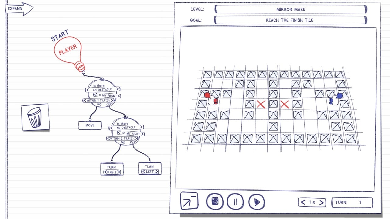 Оттачивать навыки программирования в Sketchbots приходится на рисованном блокноте, где пользователи смогут создавать желаемые комбинации из серии действий, основанных на использовании узлов. При помощи связок из нескольких фрагментов, можно направлять в необходимое место робота. Главной задачей для геймера станет решение головоломок на бумажном листике, где комплексные соединения и комбинации выполнены в виде нарисованных объектов.