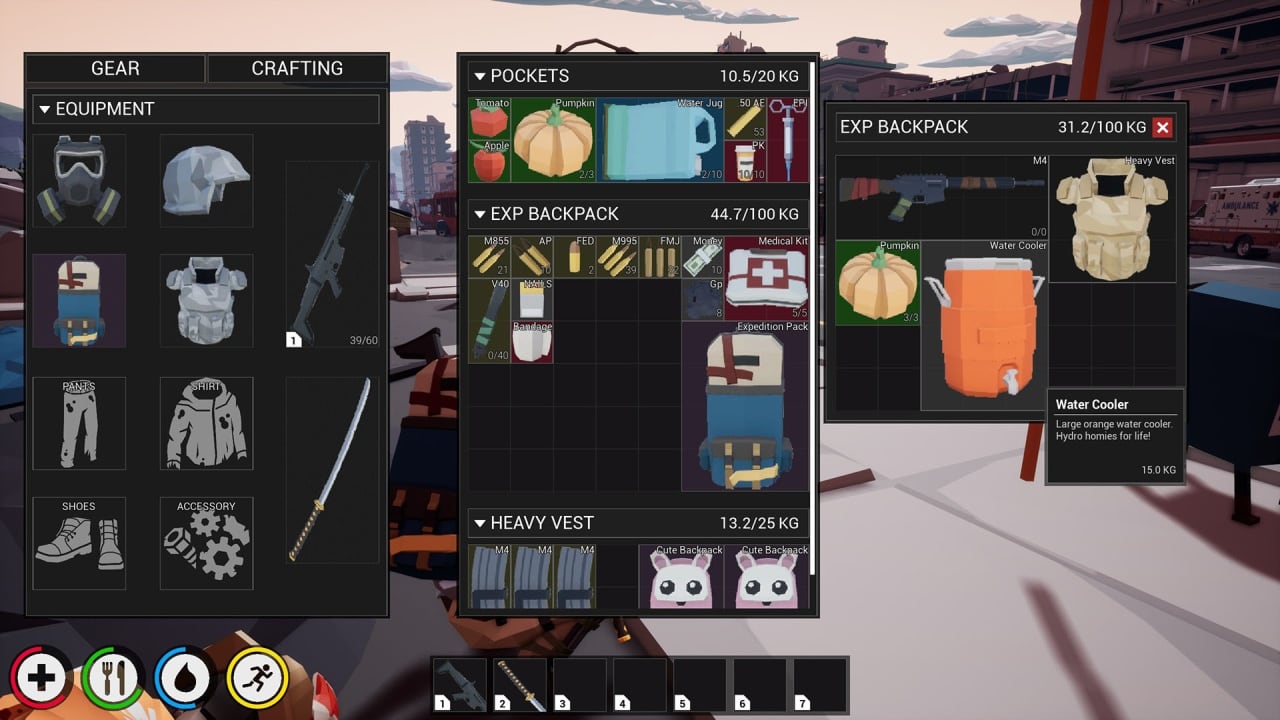 Крафт позволяет построить базу и возвести укрепления. Различные материалы и мусор помогают прокачать пушки или оружие ближнего боя. Доступны для сбора камень, дерево, металл и множество других материалов. Каждый предмет имеет свои уникальные физические свойства. Представлено более 100 уникальных предметов для использования и десятки разнообразных пушек. Присутствует дневной и ночной цикл. Время суток напрямую влияет на геймплей. Днем лучше заниматься сбором ресурсов, в то время как ночью желательно находиться на базе, поскольку противники становятся опаснее. Основная задача - выжить любой ценой во время зомби-апокалипсиса.