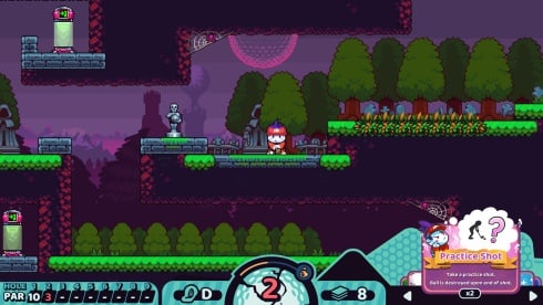 Стиль оформления Cursed to Golf, ровно, как и игровой процесс, полностью соответствует двухмерным проектам. Каждый раз, персонаж оказывается в определенной точке пространства, откуда и нужно запускать шар. Задача такая же, как и в привычной версии игры - попасть в лунку. Но есть несколько нюансов. Во-первых, количество попыток ограничено, и при любом контакте с неприемлемой средой (шипы, падение в пропасть или в воду) попытка сгорает. Но все не так плохо, ведь на более поздних стадиях начнут появляться бонусы и особые штуки. Например, портал, через который можно отправить мяч на более отдаленное расстояние, увеличив скорость полета. Или, если сбить статую, можно получить 4 дополнительных удара. Всего, на пути будет более 20 таких усилителей, установленных в специально отведенных местах. Но это не повод расслабляться, ведь траекторию удара и его силу все также нужно рассчитывать самостоятельно.