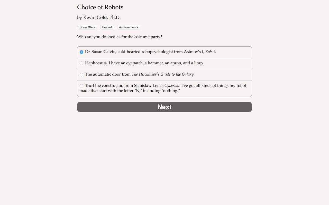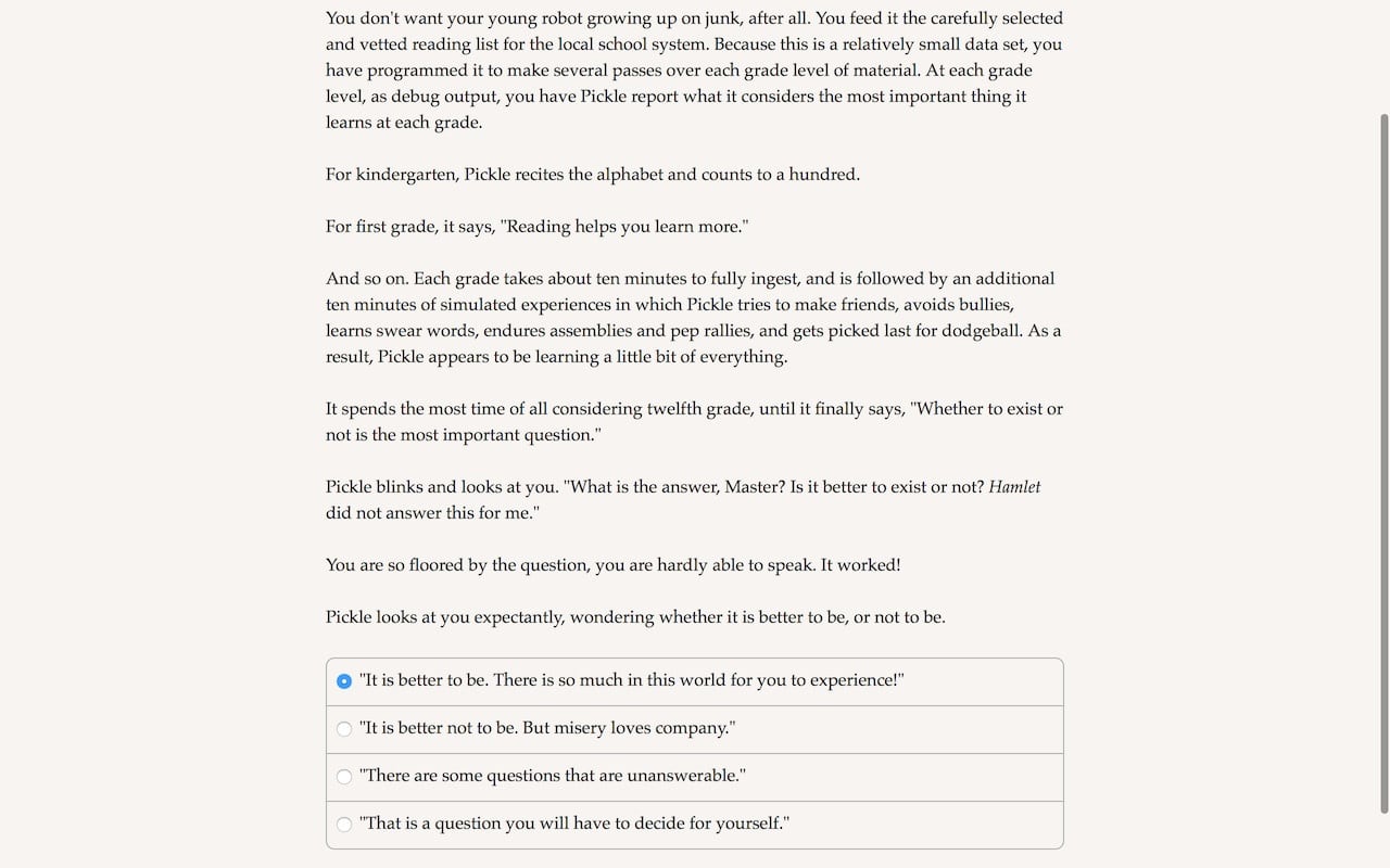 Choice of Robots Полная версия Последняя Дата выхода 19 дек. 2014 Разработчик Choice of Games Жанр Инди, RPG, Визуальная новелла Крайне положительные на основе 1892 обзоров в Steam 96% Обновлено 26 января 2025, 08:31 Список изменений Choice of Robots – игра, сфокусированная на сюжете, но он передается через текст. Без звуковых эффектов, анимации и графики, только предложения, диалоги и мысли главного героя на белом фоне. Событие разворачивается по мотивам научно-фантастического романа Кевина Голда, а проект включает свыше 300 000 слов. Также прохождение основывается на выборах игрока. Пользователь берёт управление над изобретателем, работающим в сфере роботов. Предстоит пройти 30 внутриигровых лет за всё прохождение. Геймплей начинается, когда главный герой имеет большое влияние на всю сферу роботов. Он способен контролировать их действия и цели. Роботы могут быть холодными или сочувствующими, неуклюжими, послушными или независимыми. Перед началом геймер настраивает центрального персонажа, выбирая пол, характер и ориентацию. Представлено 9 романтических героев и четыре кульминационные главы. В зависимости от действий юзера, в мире решится судьба роботов. Можно создать искусственный интеллект, чтобы он стал правителем мира через войну или убеждения. Игрок способен начать войну с Соединенными Штатами, построить семью или дать ИИ свободу действий, чтобы тот сам решал, что делать в мире. Герой может дожить до старости, в одиночестве, с роботами или женой и детьми, либо умереть из-за разных обстоятельств. Существует 70+ достижений для разблокировки. Скачать торрент Скриншоты Показать больше Видео из игры Скачать Choice of Robots Тип релиза Пиратка (Таблетка: Вшита) Версия (Полная) Последняя Размер 27.68 МБ Интерфейс Английский Озвучка Отсутствует Скачать .torrent торрент файл Скачать БЕЗ торрента прямая ссылка через uTorria Системные требования ОС: 7, 8, 10 Выбери себе приключение, Решения с последствиями, Роботы, Научная фантастика, Глубокий сюжет, Протагонистка, Романтика