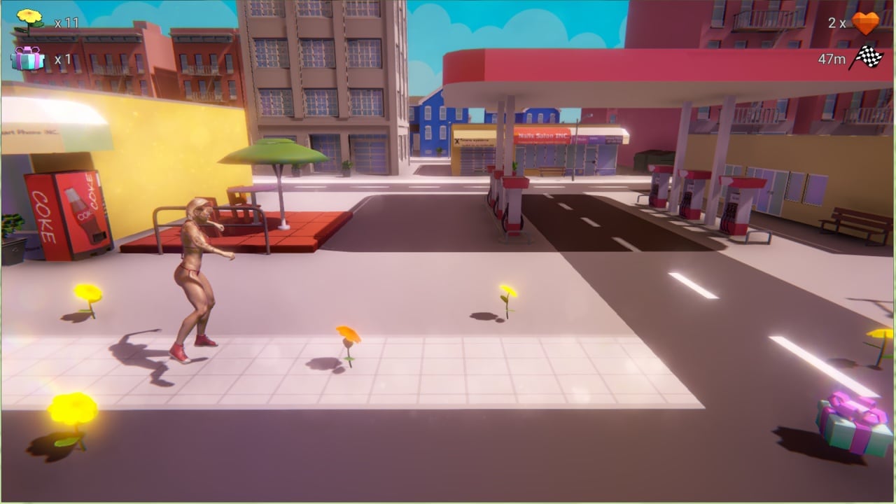 В процессе прохождения "Бегущая девушка", геймеры будут выбирать между уровнями "Сон" или "Кошмар". В первом случае приходится бегать и собирать подарки и цветы, что будут разбросаны на бесконечном маршруте, а во втором случае необходимо находить конфеты на локациях и вступать в схватки с опасными боссами. В режиме "Кошмар" придется выполнить 9 заданий, где важно пробежать и не потратить здоровье персонажа. Передвигаясь по городским улочкам, девчонка будет подбирать красные сердечки (дают дополнительные жизни), зеленые шары (наделяют неуязвимостью), магниты (притягивают ближайшие цветы) и синие звездочки (даруют ускорение), Каждый из бафов действует ограниченное время и позволяет улучшить результаты прохождения.
