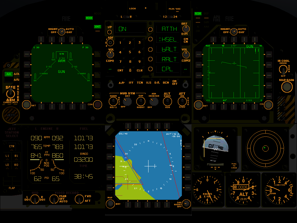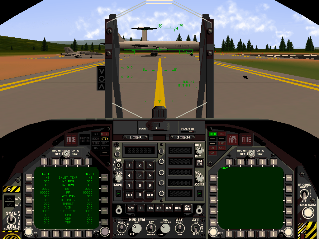 Интерфейс в F/A-18 Precision Strike Fighter устроен таким образом, чтобы пользователи могли получать доступ ко всей необходимой информации. За каждой клавишей и рычагом, который находится в кабине, закреплена клавиша на клавиатуре, но при желании можно использовать мышку, кликая на нужный прибор. Там также расположен спидометр, показатель давления за бортом, углы наклона корпуса и прочие важные показатели, за которыми нужно следить во время полета. При этом, камера не привязана к какой-то оси, поэтому можно производить полноценный обзор территории, выводя ракурс за пределы кабины, осматривая сушу и пространство впереди себя. При этом, куда бы не посмотрел игрок, он постоянно будет видеть перед собой прицел и систему наведения. И если в поле зрения появится потенциальная цель, можно будет сразу же выпустить по ней ракеты или открыть огонь из пулеметов.