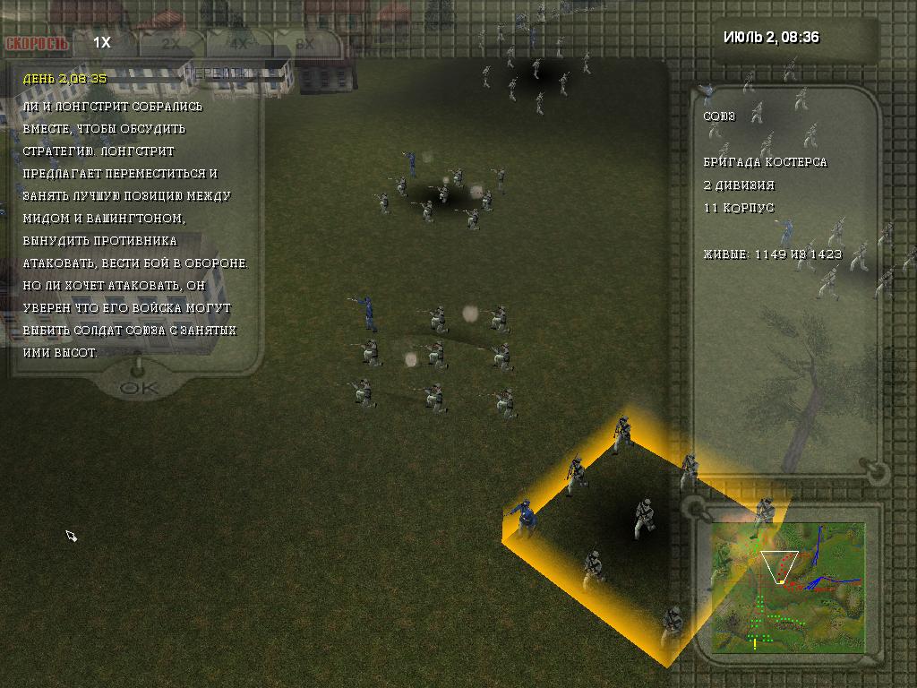 Gettysburg 1863 RUS Полная версия Последняя Дата выхода 2003 Разработчик Stellar Stone Жанр Стратегии Обновлено 26 января 2025, 14:34 Список изменений Gettysburg 1863 переносит на территории Северной Америки, где в средине прошлого века шла масштабная и кровопролитная Гражданская война. Штаты воевали между собой из-за рабства, которое все еще существовало на юге, но было искоренено на севере. Одно из ключевых противостояний произошло при небольшом городке Геттисберг, в котором полегли десятки тысяч солдат с обеих сторон. Сражение длилось всего три дня, в рамках которого войска под командованием генерала Мида смогли совершить успешную контратаку и вытеснить врага с поселения. Это остановило вторжение южан и переломило ход всей конфронтации. В рамках прохождения Gettysburg 1863 игроку дается возможность взять под управление одну из сторон конфликта и привести ее к победе. В отличие от большинства тактических стратегий, здесь геймеру не нужно заниматься строительством базы, добычей ресурсов или же созданием армии. Войско дается в начале каждой миссии и по ходу ее выполнения нанять дополнительных невозможно – придется располагать тем, что имеется на старте. Все передвижения войск происходят в пошаговом режиме. Пользователь и ИИ двигают свои подразделения на карте, разделенной на сегменты (квадраты). Чтобы достичь успеха на определенном участке фронта потребуется обладать определенными тактическими и стратегическими навыками. Важно проводить эффективные маневры, использовать условия местности и сильные стороны каждого отдельного отряда. Также важно учитывать слабые стороны солдат, перекрывая их при помощи тактических решений. Скачать торрент Скриншоты Показать больше Видео из игры Скачать Gettysburg 1863 Тип релиза Пиратка Фаргус (Таблетка: Не требуется) Версия (Полная) Последняя Размер 35.2 МБ Интерфейс Русский Озвучка Отсутствует Установка: Примечание Внимание!!! Игра Gettysburg 1863 входит в состав большого сборника игр от Фаргус размером в 443 ГБ. Скачивая данный торрент, убедитесь, что вы сняли галочки с не интересующих вас игр. Скачать .torrent торрент файл Скачать БЕЗ торрента прямая ссылка через uTorria Системные требования ОС: XP / Vista/ 7 / 8 / 10 Процессор: 266 MHz Оперативная память: 64 МБ Видеокарта: 3D Тактика, В реальном времени, Стратегии в реальном времени, Тактика в реальном времени, Строительство базы, Управление ресурсами, Историческая, Ретро, Олдскул