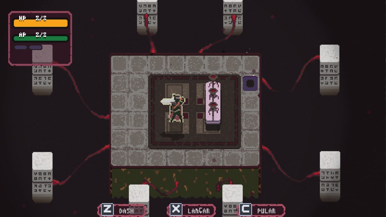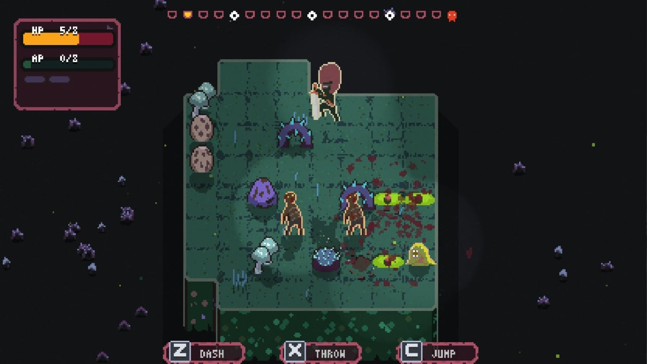 Геймплей в Undergrave похож на Red Ronin – другую игру от тех же разработчиков. Игровой процесс напоминает модифицированный сокобан. У героя есть 3 способности. Он может метать свой клинок в нескольких направлениях, совершать рывок по прямой линии (пока не упрется в препятствие) и прыгать по вертикали, горизонтали и диагонали. Все эти активности расходуют шкалу выносливости. Каждый ход эта полоска понемногу восстанавливается. Если у бойца есть меч в руке, то он при контакте с противником наносит ему урон или убивает. Можно уничтожать несколько супостатов за одно движение. Если воин безоружен, то он отталкивает или оглушает недругов.