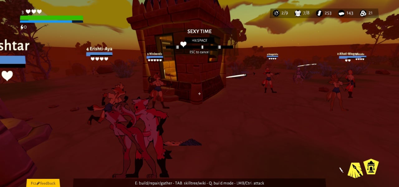 В ночное время суток, на поселение будут волнами нападать вражеские захватчики, от которых приходится отбиваться бойцам. Игроки будут прокачивать своих персонажей, исследуя специальное дерево навыков. Получится улучшить боевые способности юнитов, чтобы они успешнее отражали атаки противника. Пользователям в игре придется изучать окружающий мир, искать книги со знаниями, строить сексуальные статуи для получения пассивных умений, общаться со случайными NPC на карте, а также бродить по процедурно сгенерированных локациях и данжах.