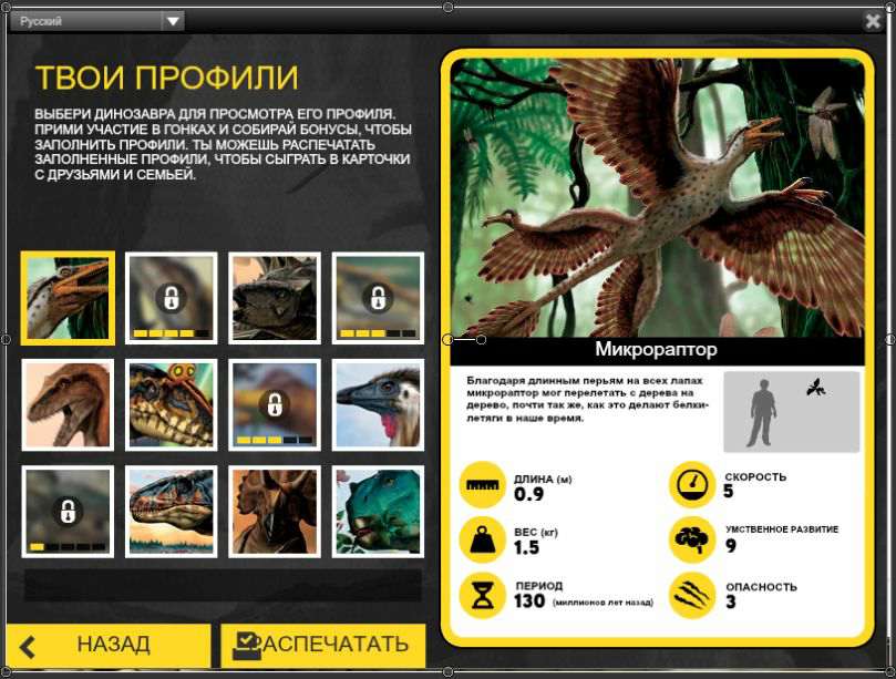 Dinosaur Race Forest RUS Полная версия Последняя Дата выхода 2013 Разработчик Adon Production Жанр Гонки, Аркады Обновлено 26 января 2025, 13:49 Список изменений Dinosaur Race Forest – это увлекательная игра, в которую можно играть фанатам динозавров всех возрастов. Это уникальная игра, которая ранее шла только с сухими стилизованными завтраками и считает эксклюзивной. В ней содержится не только забавная аркада с разными видами рептилий, но и полноценная энциклопедия о разных видах. В этой игре нет никакого сюжета, просто веселая гонка, где можно соревноваться с другими динозаврами, беря под контроль любимый вид рептилии, которых здесь более 10-ка. За успешное прохождение уровней будут открываться новые животные, в том числе прародители птиц, которые способны летать на короткие расстояния. Главное здесь не скорость, а ловкость, чтобы избегать столкновения с деревьями и другими преградами. Побеждает тот, кому удается более четко пробежать дистанцию и при этом обогнать все своих противников. Применять против них ловушки или кусать строго запрещено, потому предстоит соблюдать минимальные правила и уважение к других участникам активного забега. Некоторые уровни Диносаур Рейс Форест обладают определенными миссиями, чтобы немного разнообразить геймплей. Например, в нескольких этапах у животных начинается период гнездования, когда каждая парочка избирает для себя самое лучшее место для выведения потомства. Игроку необходимо одному из первых достигнуть наиболее хорошего и безопасного места. Скачать торрент Скриншоты Видео из игры Скачать Dinosaur Race Forest Тип релиза Лицензия (Таблетка: Не требуется) Версия (Полная) Последняя Размер 108.1 МБ Интерфейс Русский Озвучка Русская Установка: Скачать .torrent торрент файл Скачать БЕЗ торрента прямая ссылка через uTorria Системные требования ОС: XP / Vista/ 7 / 8 / 10 Процессор: Pentium 4 Оперативная память: 1 ГБ Казуальная, Смешная, Юмор, Динозавры
