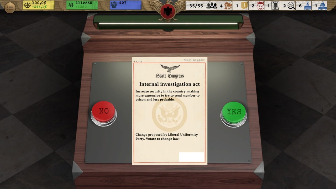 Юзеры получают возможность сажать предателей или защищать своих союзников и членов партии, следить за идеологической обстановкой населения, проводить избирательные кампании и выбирать кандидатов, менять экономику и развивать различные государственные структуры и учреждения (банки, школы, тюрьмы, СМИ и т.д.). Выйдет в каждом городе брать под контроль желаемые здания и выдавать приказы для штатных сотрудников, а также менять местные законы.