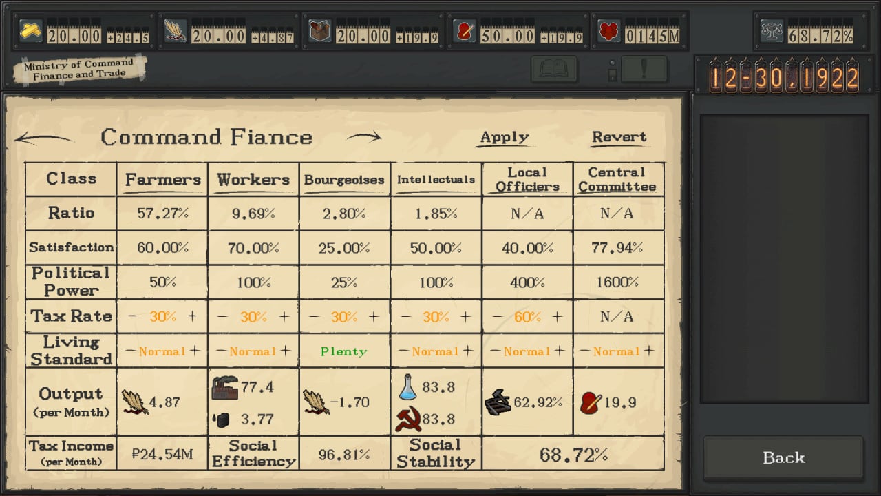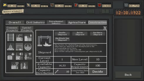 Игрокам в Совет Симулятор приходится прорабатывать график импорта и экспорта товаров, модернизировать собственное производство, уделять внимание созданию удобной инфраструктуры в городах и т.п. Также получится заниматься продажей военных технологий и техники в другие страны, что находятся в состоянии войны. Юзеры будут создавать схемы для пятилетних планов, меняя развитие и структуру промышленности.
