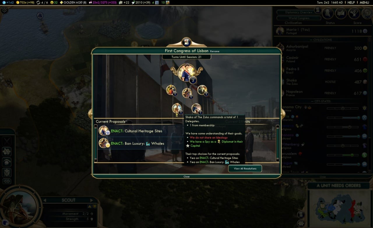 В процессе прохождения, игроки будут участвовать в дипломатических переговорах, сзывая различных деятелей на Всемирный Конгресс. Выйдет накладывать торговые санкции, создавать ограничения на поставки или добычу ресурсов, а также проводить голосования на тему ядерного вооружения. В игре присутствует механика голосования и резолюции, что приводит периодически к заговорам и межличностным интригам. Юзеры опробуют новых президентов за Польшу, Бразилию, Португалию и т.д. Выйдет построить 8 Чудес Света (Бродвей, театр "Глобус", галерея Уффици, Парфенон), поучаствовать в американских войнах, встав на сторону Конфедерации или Союза, а также побывать на Черном Континенте.