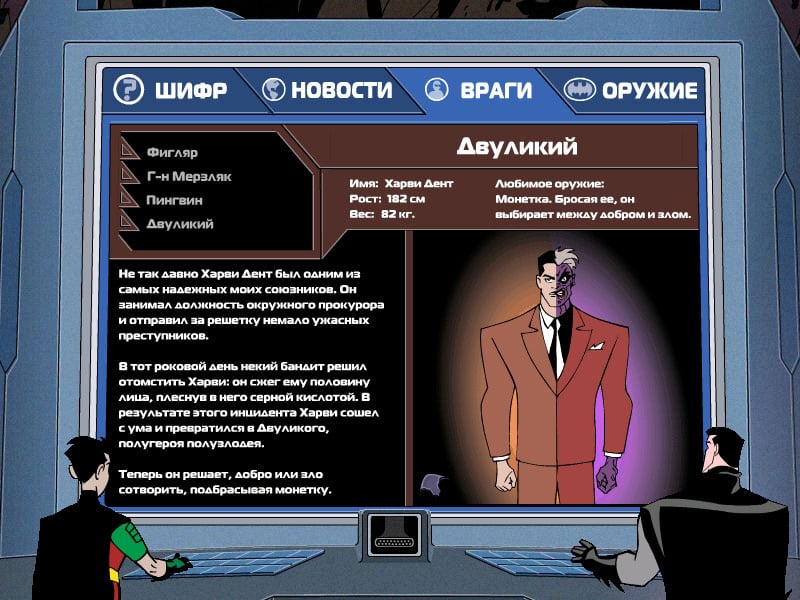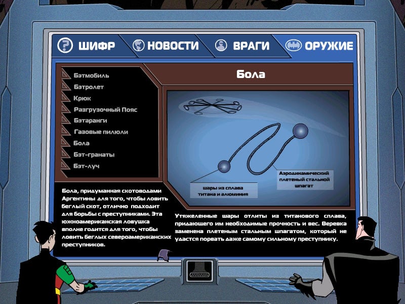 Batman Toxic Chill RUS Полная версия Последняя Дата выхода 2003 Разработчик Riverdeep Interactive Жанр Аркады Обновлено 26 января 2025, 13:59 Список изменений Batman Toxic Chill переносит игрока в мрачный городок Готэм, где предстоит наблюдать за приключениями двух героев. В прохождении потребуется взять управление над Бэтменом и Робином, а игровой процесс представлен в виде приключения с управлением "укажи и кликни". Пользователь будет перемещаться по двухмерным локациям и решать многочисленные головоломки. Персонаж будет перемещаться по карте, получая полезные сведения и подсказки, помогающие продвигаться по сюжету. Основные события Batman Toxic Chill связаны с Мистером Фризом и Загадочником. Центральному персонажу необходимо добраться до этих личностей и сразиться с ними. Для этого потребуется преодолеть десятки опасностей, решить множество головоломок и разгадать тайны, попадающиеся на пути. Пользователю потребуется помогать мирным жителям и сражаться со злодеями в Готэм-Сити, которые обладают коварными планами и постоянно генерируют какие-либо опасности для окружения. В приключении появляется новые персонаж – Бетгёрл, которая поможет противостоять преступникам и бандитам. Она обладает сверхвозможностями, позволяющими ей выживать в трудных ситуациях и побеждать оппонентов в трудных сражениях. По мере прогресса появляются кат-сцены и анимированные ролики, продвигающие историю. В геймплее понадобится взаимодействовать с окружением, подбирать предметы и открывать доступ к новым участкам города. Скачать торрент Скриншоты Видео из игры Скачать Batman Toxic Chill Тип релиза Лицензия (Таблетка: Присутствует) Версия (Полная) Последняя Размер 672.7 МБ Интерфейс Русский Озвучка Русская Установка: Скачать .torrent торрент файл Скачать БЕЗ торрента прямая ссылка через uTorria Системные требования ОС: 98 / 2000 / ME / XP / Vista / 7 Процессор: Pentium-II 266 MHz Оперативная память: 64 МБ Видеокарта: 4 МБ Место на диске: 100 МБ Головоломка, Игры в 2D, Point and click, Тайна, Исследования, Поиск предметов, Детектив, Расследования, Олдскул