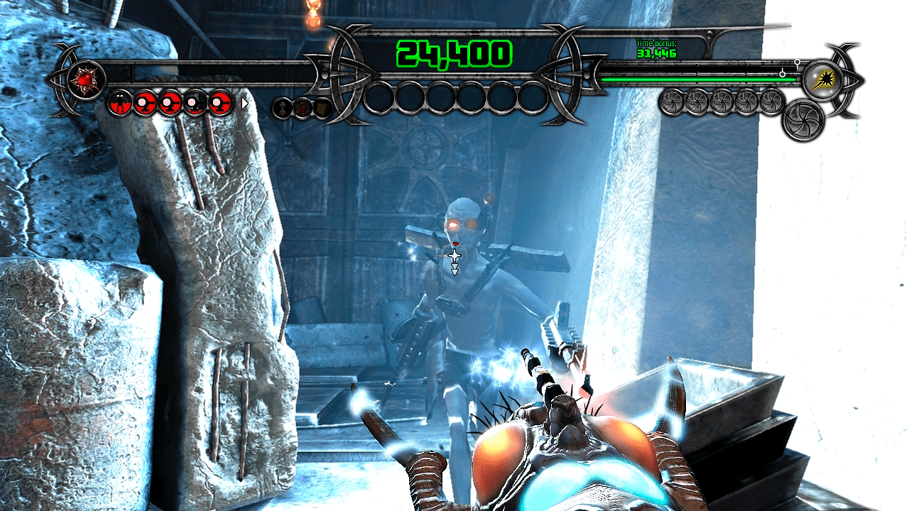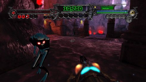 Сражаться нам придется с различными созданиями: зомби в хоккейных масках, желтыми пауками, турелями и т.д. Ландшафты и локации представляют собой фиолетовые пещеры, индейское поселение, руины древнего храма и поросший мхом завод по производству ядерного оружия. В Xotic доступен игровой счет, который влияет на рейтинг. За каждый пройденный этап, герой получает очки опыта, позволяющие прокачивать и модернизировать себя и свое оборудование. Со временем герой сможет использовать зажигательные снаряды, швырять молнии и выпускать рой разрывных комаров. Также в игровой процесс вшиты элементы платформинга, поэтому придется постоянно подниматься на верхние ярусы или перепрыгивать препятствия по узким балкам и утесам.