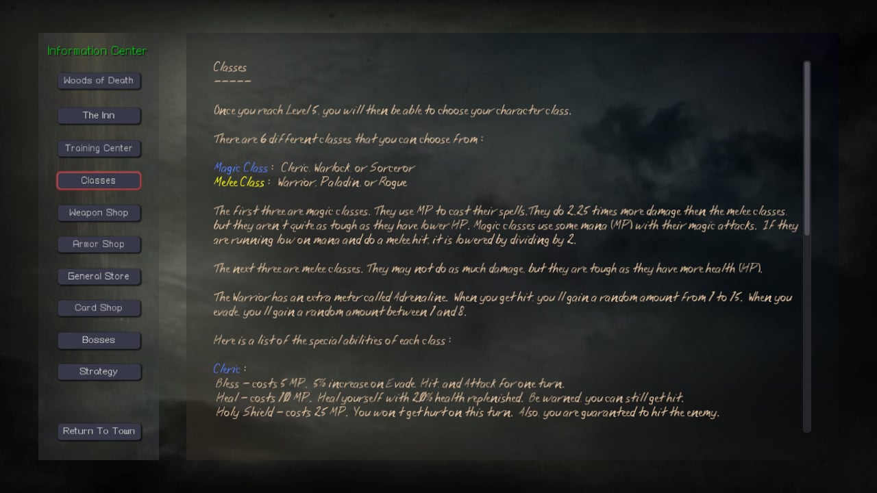 Woods of Death 2 – ролевое приключение с пошаговыми сражениями и оригинальными способностями для применения. Действие разворачивается в обширном и опасном лесу, где главный герой столкнется с 60 врагами и тремя могущественными боссами. Если удастся пройти каждого противника, то путешествие будет удачно завершено. Каждый оппонент уникален, обладает собственными способностями, сильными сторонами и слабостями.