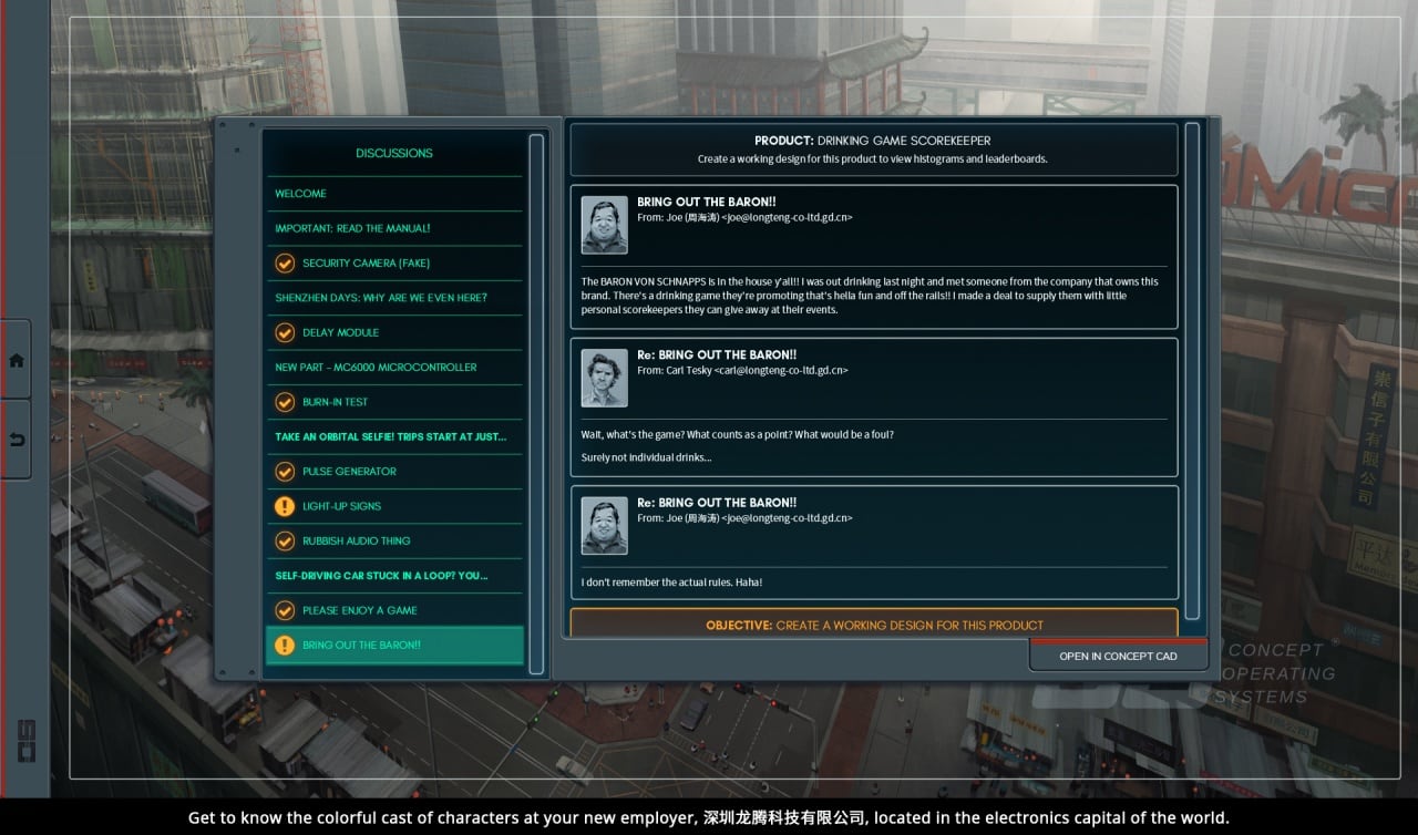 Сюжет игры начинается, с прибытием в китайский город Шэньчжэнь, и трудоустройством на работу в вымышленную компанию Shenzhen Longteng Electronics. Поскольку игрок в этой кампании новичок, ему не будут сразу давать сложные задания, однако от вас ждут, умения упорно учится и схватывать все на лету. Начало первого рабочего дня начинается с проверки почты, где мы видим множество писем, начиная от генерального директора и заканчивая непосредственным начальником, который и присылает нам первое поручение. Игроку дают задания по разработке продуктов для клиентов, написание кода и создание электронных схем.