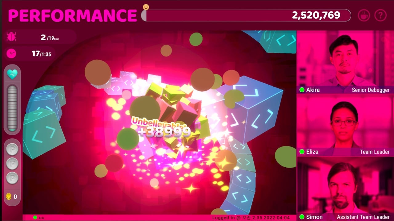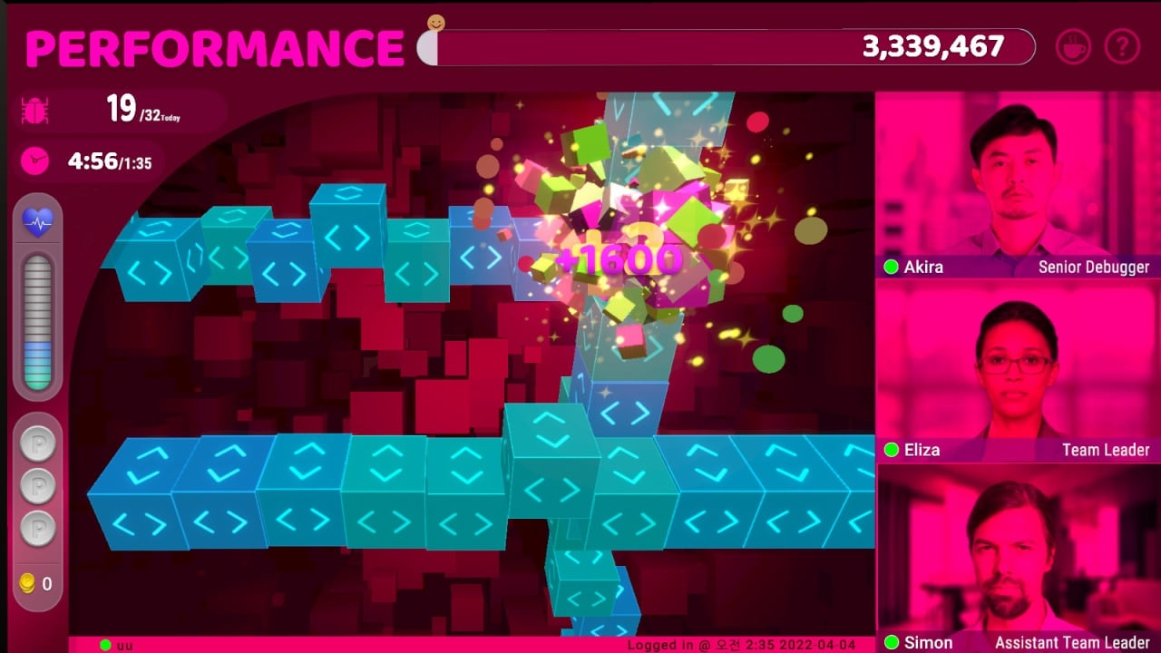 Квесты, в виде движущихся цепочек блоков кода, которые предстоит разбивать, будут генерироваться случайным образом до бесконечности. Чтобы отвлечься, можно погоняться по квартире за жуками, вот только чем чаще персонаж отдыхает, тем сильнее расстраивается босс, который может отказаться от сотрудничества с протагонистом. Но это весело, давить насекомых так, что их останки размазываются по стене и падают на пол.