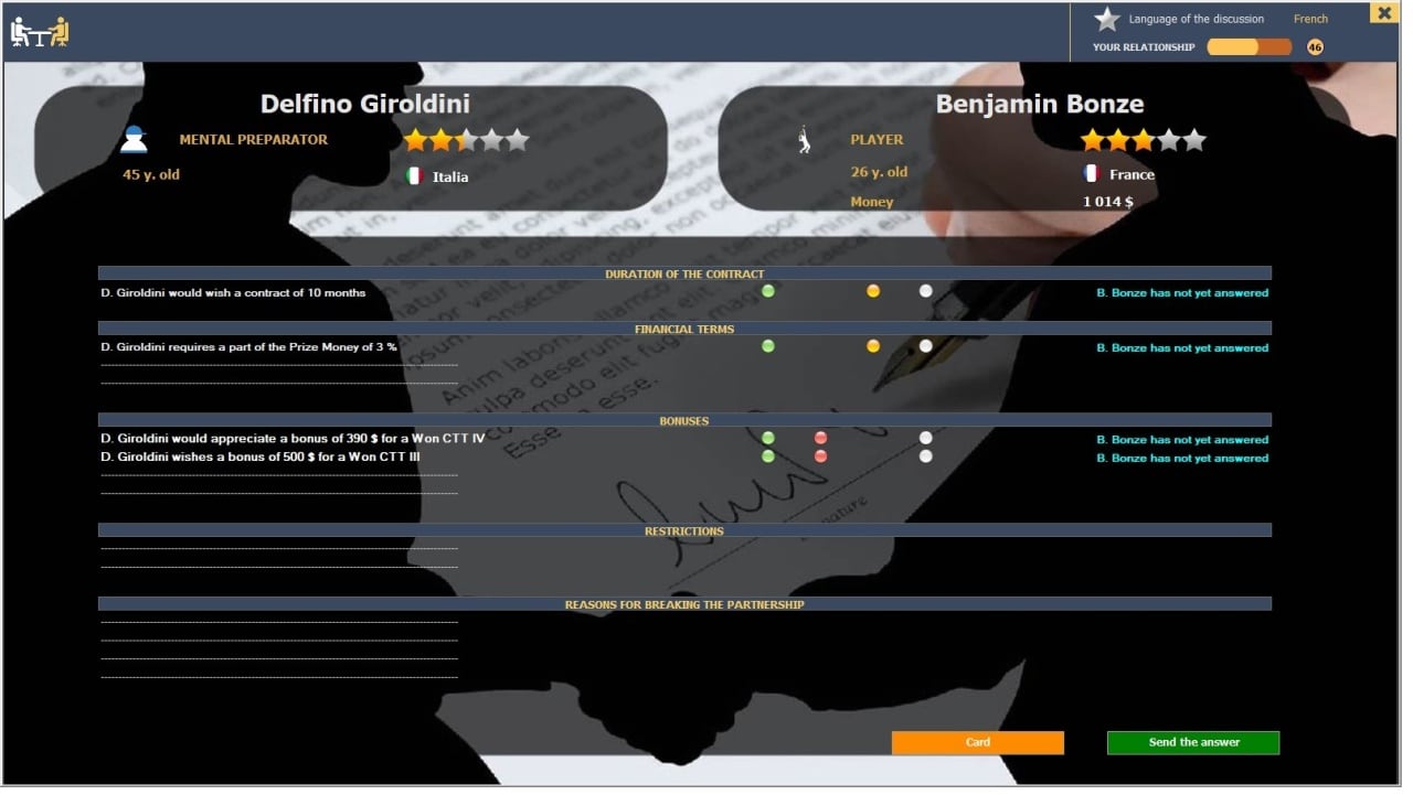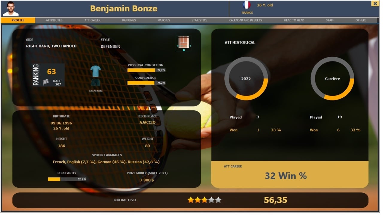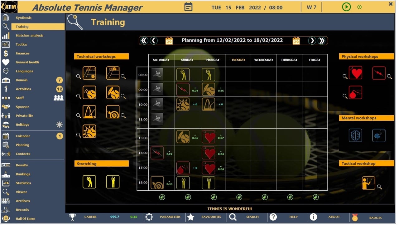 Помимо этого, персонажу понадобится развиваться не только физически, но ментально и умственно. Не менее важно вовремя регистрироваться в турнирах, доступных в соответствии с таблицей рейтинга, применять различные стратегии, грамотно распределять баланс средств. Да и про отдых, семью и путешествия в Absolute Tennis Manager нельзя забывать. Доступны мировые лиги, такие как Кубок Дэвиса, Олимпийские игры, Мейджоры, ИТФ и АТР.