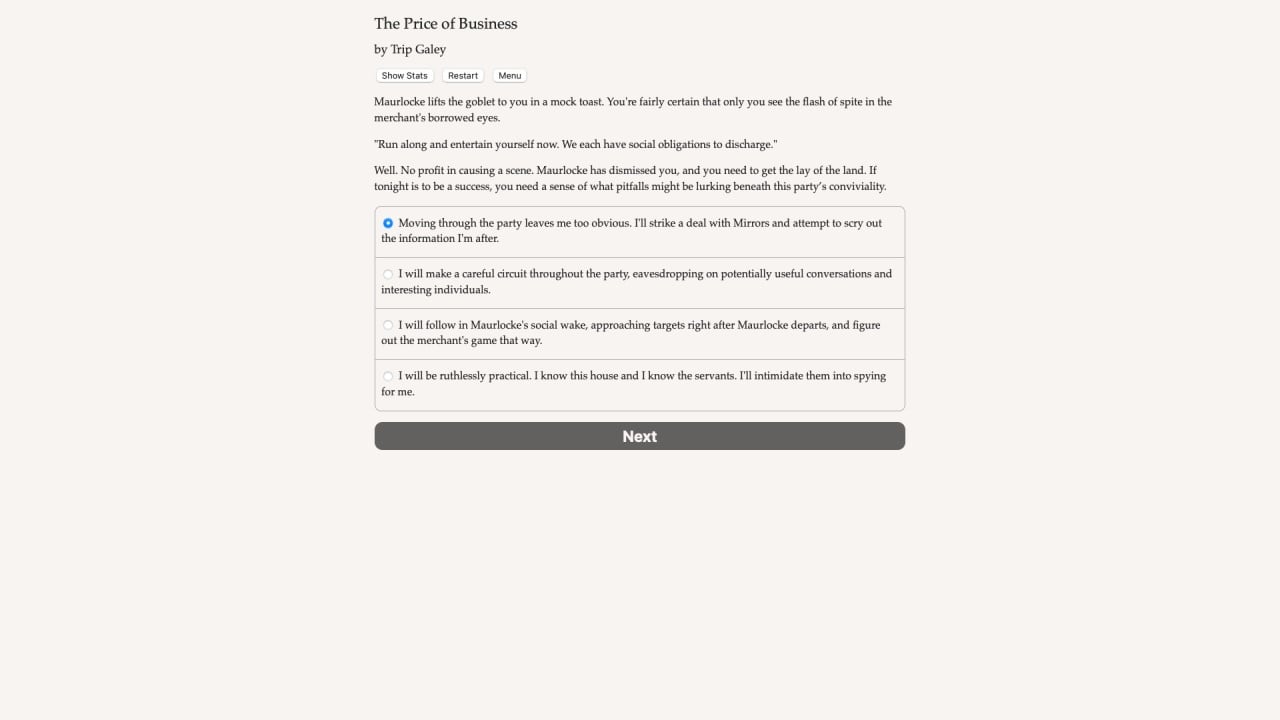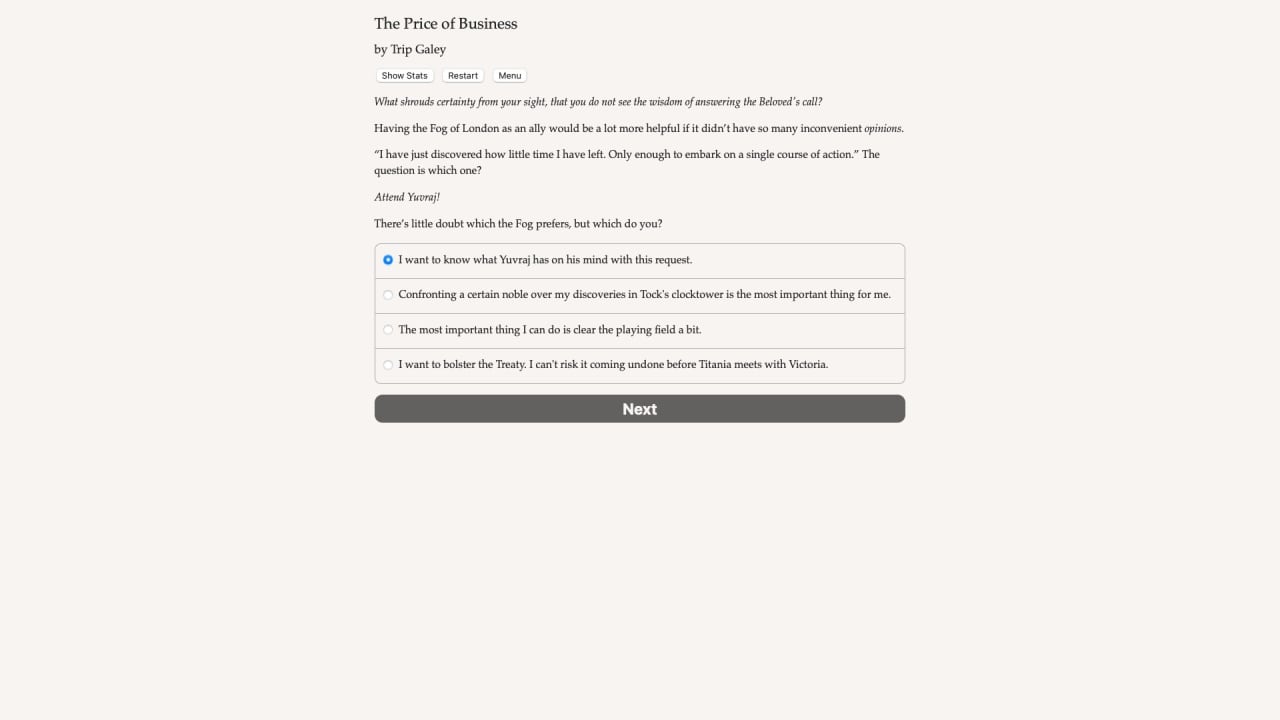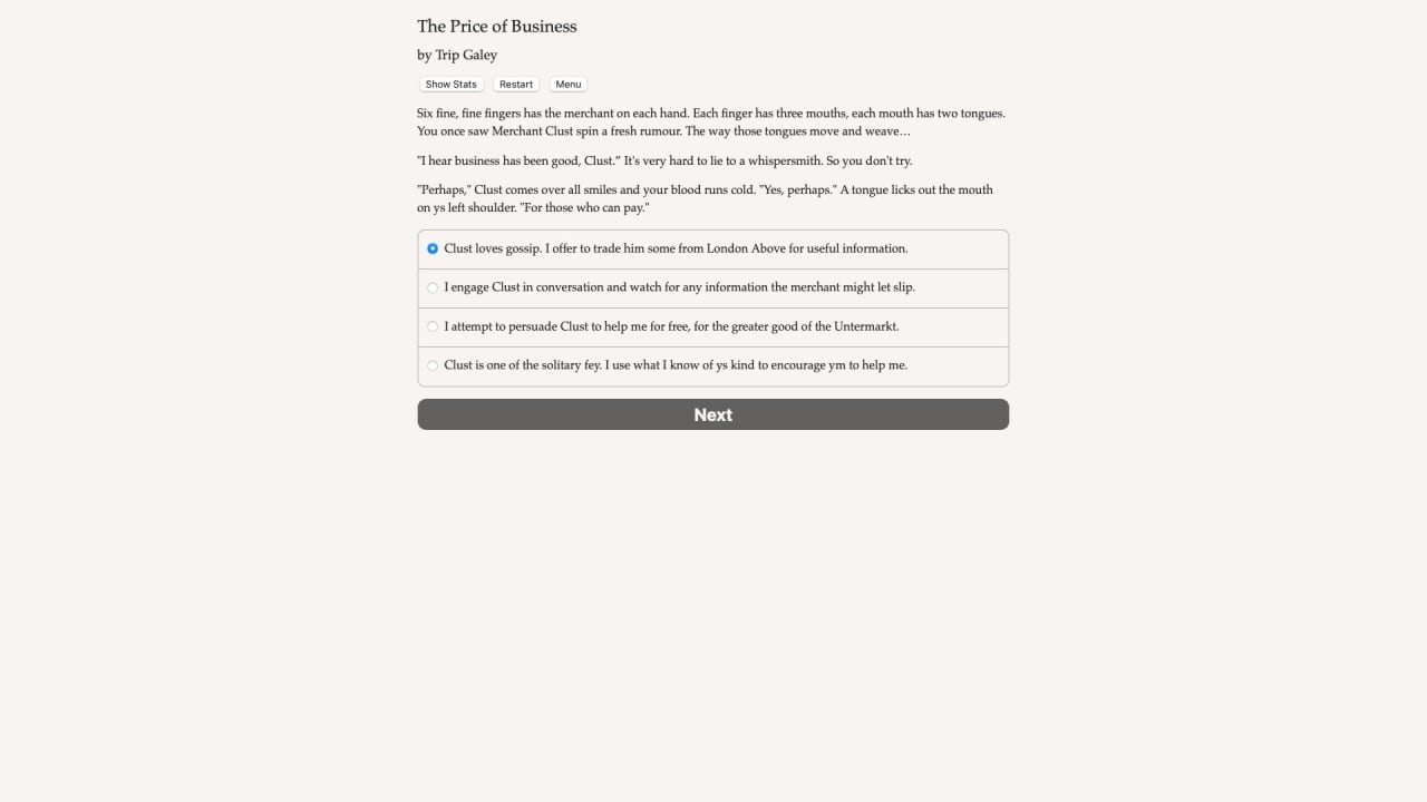 Faerie's Bargain: The Price of Business Полная версия Последняя Дата выхода 2 дек. 2021 Разработчик Choice of Games Жанр RPG В основном положительные на основе 18 обзоров в Steam 72% Обновлено 26 января 2025, 13:16 Список изменений Мир игры Faerie's Bargain: The Price of Business - это викторианская Англия, где обыденность сосуществует со сверхъестественным. Во дворцам заседают человеческие лорды, решающие судьбы державы, а в переулках бродят гномы и гоблины. Главный герой - торговец, но не едой, одеждой или еще чем-то тривиальным, о нет. Протагонист - продавец особых вещей. Если клиенту требуется поцелуй истинный любви, второй шанс, платье из лунного света или время, закупоренное в бутылке - основной персонаж с радостью все это предоставит. Соответственно, сюжет в Faerie's Bargain: The Price of Business нелинейный. Геймер может заниматься всем, чем захочет. Разработчик предусмотрел и реализовал возможность персонажа присоединиться к заговору против владычицы Британии. В случае успеха можно посадить на трон купленного королька и править империей из тени. Еще протагонист способен вступить в войну с торговым конклавом, чтобы подмять все богатства фэйри под себя. Также пользователь может стать патриотом Англии и верной слугой королевы, уничтожающим тех, кто угрожает престолу. Кастомизация персонажа также обширная. При желании, геймер может сделать своего героя мужчиной, женщиной или бесполым созданием любой ориентации, цвета кожи и видовой принадлежности. Персонажа можно превратить в святого, подкармливающего сироток, или в мерзавца без зачатков совести. Однако, в игре полностью отсутствуют анимация, картинки и музыкальное сопровождение. Всю информацию пользователь получает через текст, как при чтении романа. Скачать торрент Скриншоты Показать больше Видео из игры Скачать Faerie's Bargain: The Price of Business Тип релиза Пиратка (Таблетка: Не требуется) Версия (Полная) Последняя Размер 37.81 МБ Интерфейс Английский Озвучка Отсутствует Скачать .torrent торрент файл Скачать БЕЗ торрента прямая ссылка через uTorria Системные требования ОС: Windows 7, 8, 10 Процессор: Dual Core 2.0 GHz Оперативная память: 2 ГБ Видеокарта: Intel HD 3000 Место на диске: 100 МБ Выбери себе приключение, Фэнтези, Магия, Сверхъестественное, Решения с последствиями, Несколько концовок, Глубокий сюжет, Тёмное фэнтези, Проработанная вселенная, Стимпанк