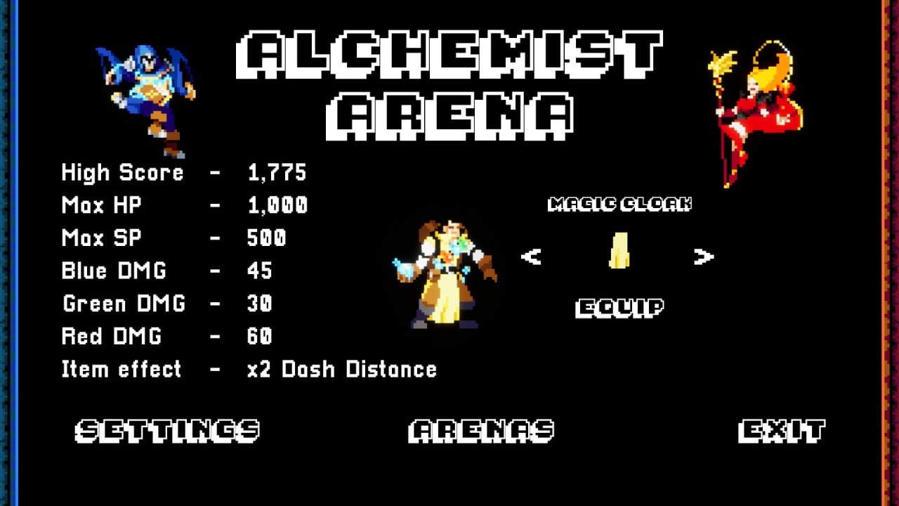 Пользователь сможет почувствовать ностальгию с ретро-бойцам на поле боя. Враги, с которыми придется столкнуться будут очень разные и каждый будет иметь свою характеристику и особенность. Также присутствуют боссы, являющиеся самыми мощными антагонистами. В Alchemist Arena протагонист будет храбро вести битву на 10 уникальных карт. Для более хорошего эффекта стоит использовать прыжки вверх, неожиданно рваться, парировать и создавать взрывные атаки, чтобы уложить всех своих врагов.
