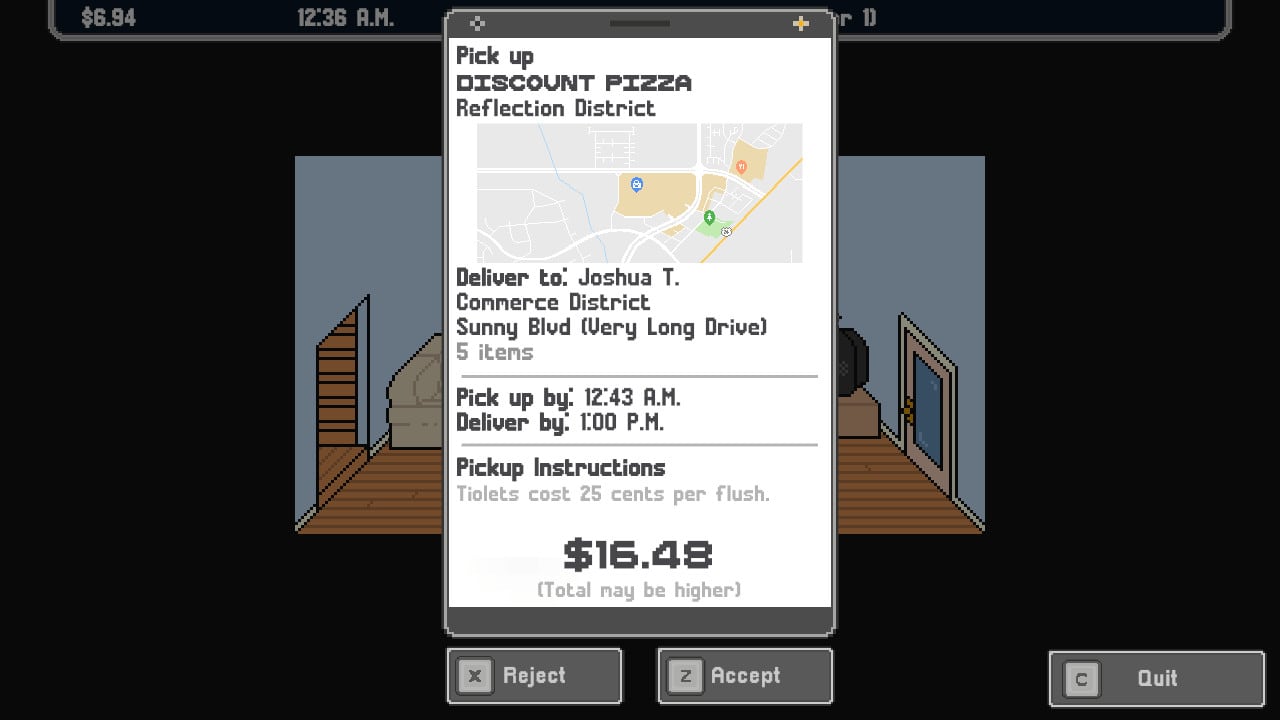 - выбирать еду из 6 заведений, после чего перевозить заказы покупателей на нужные адреса;