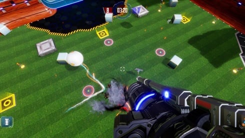 В R.E.A.C.T нужно также, как в классическом футболе, забивать мячи в ворота противников. Вот только здесь для этого есть пулеметы, автоматы и винтовки, а также другие предметы. Нужно будет сделать как можно больше голов, и перегнать по этим показателям команду-противника. Есть несколько режимов игры, и все они отличаются количество пользователей. Так, можно создать дуэль друг против друга, сделать команды по 2 человека или же по 3. Перед каждым матчем можно выбрать перки. Всего их доступно 3. Это привилегии мяча, улучшение оружия или же перспективы на карте. Но можно нажать рандом, чтобы улучшения выбрались случайно.