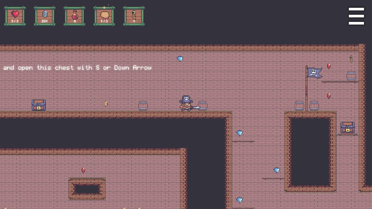 В игре Пиксельный Пират герой может бегать влево и вправо, прыгать и махать саблей. С помощью оружия можно не только атаковать врагов, но и разбивать деревянные бочки. Персонаж движется по инерции. Управляется он с клавиатуры при помощи стрелок или кнопок W, A, S, D. На локациях ему встречаются сундуки. Чтобы получить их содержимое, необходимо иметь при себе ключи. Их можно отыскать на уровнях или купить в магазине за найденные драгоценности. Там же можно потратить полученное золото на приобретение апгрейдов. Например: можно взять дополнительные сердца, тем самым увеличив здоровье, или бутылочки с целебным снадобьем. С подобными улучшениями геймплей становится легче.