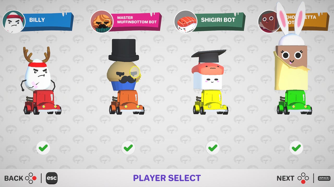 В Toasted! все участники катаются на детских электромобилях. Машинки способы ездить в разных направлениях, прыгать и делать рывок. С помощью дэша можно не только таранить другие тачки, но и в последний момент вернуться на платформу в момент начала падения в пропасть. Присутствует выбор персонажей. Всего тут 8 гонщиков. Все они являются ожившей человекоподобной едой. Здесь есть яйцо, шоколадка, суши, кекс, тост, кусок ветчины и другие блюда. Облик этих гонщиков можно слегка кастомизировать, подбирая им шляпы и настраивая цвета. Схватки рассчитаны на четырех участников. Это могут быть геймеры или боты. Можно настраивать сложность искусственного интеллекта. Локальный мультиплеер позволяет играть вдвоем, втроем или вчетвером за одним компьютером при наличии геймпадов.