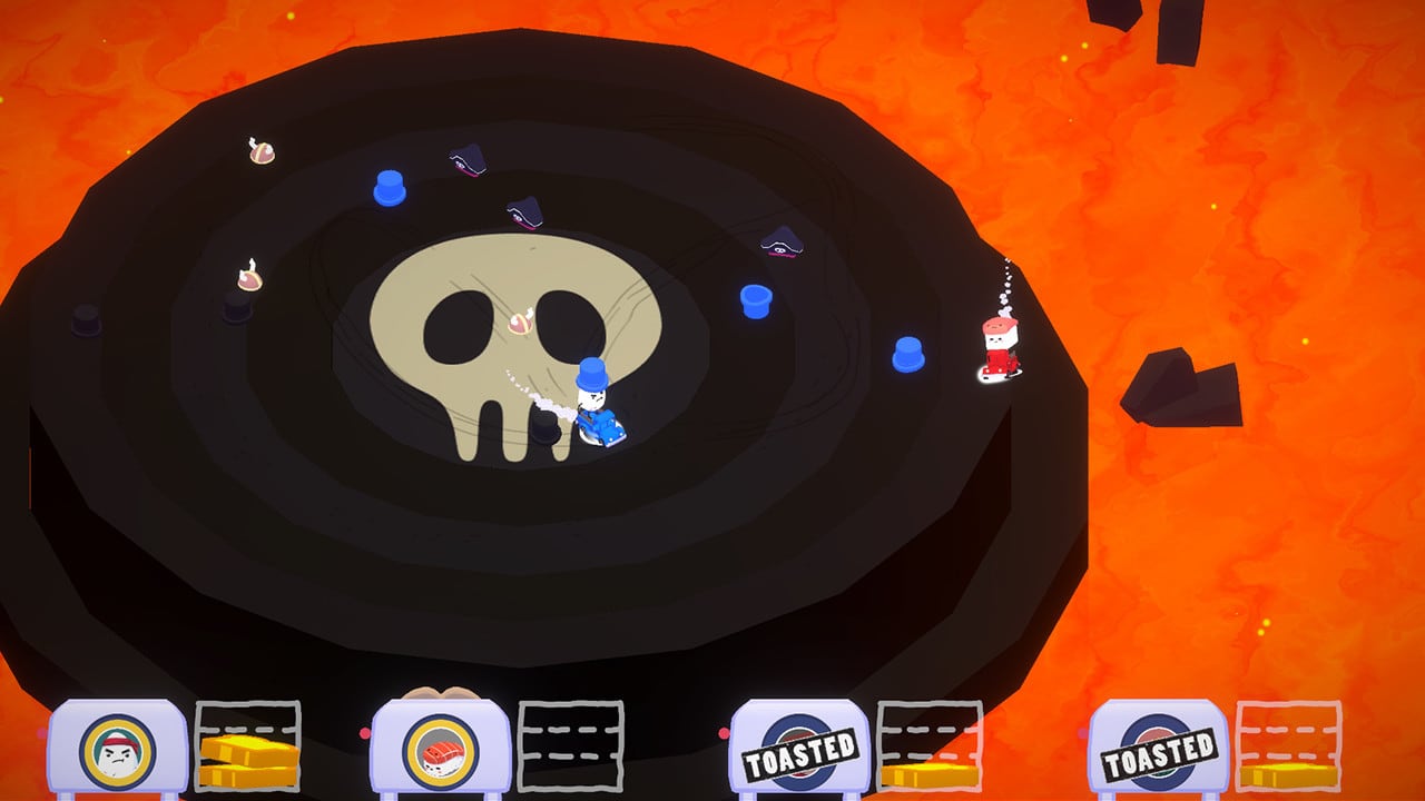 Toasted! можно отнести к гонкам на выживание. В этой игре также есть элементы браулера. Тут нет привычных заездов по трассам. Вместо этого тайтл предлагает сражаться с конкурентами на аренах. Каждый уровень умещается в пределах одного экрана, а камера размещена на высоте птичьего полета. Чтобы победить в схватке, надо вытолкать всех соперников за пределы карты. Побеждает тот водитель, что сможет стать единственным уцелевшим. Сами локации довольно разнообразные. Есть две заснеженные горные вершины, разделенные пропастью, гигантский пончик, островок со Стоунхенджем, деревянная пристань, небольшой каменный остров посреди кипящей лавы.