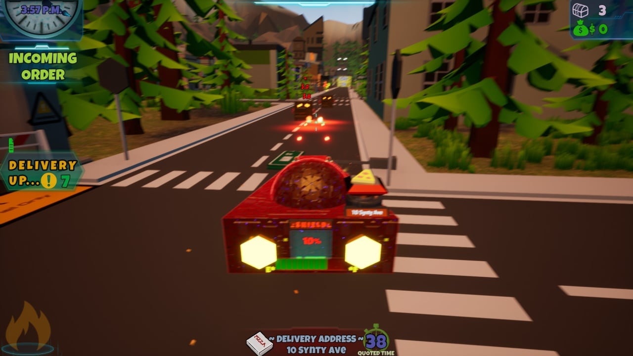 Доставка пиццы 3000 – это гибрид экшена и гонок с видом от третьего лица и трехмерной низкополигональной графикой. Основной геймплей состоит в том, чтобы отвозить заказы людям на время. Помимо заездов с таймерами в игре есть полицейские погони. Можно уничтожать преследователей или просто обгонять и обводить их вокруг пальца. Заработанные деньги можно потратить на улучшение оружия, прокачку автомобиля и совершенствование кухни. Чтобы получить доступ к некоторым апгрейдам, нужно собирать разбросанные по городским улицам страницы Книги За (так называется утерянный артефакт). В инди-тайтле есть частично открытый мир. Доступная для езды зона расширяется по мере прохождения. Ориентироваться на местности можно при помощи мини-карты.