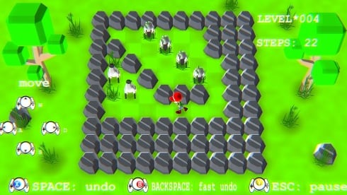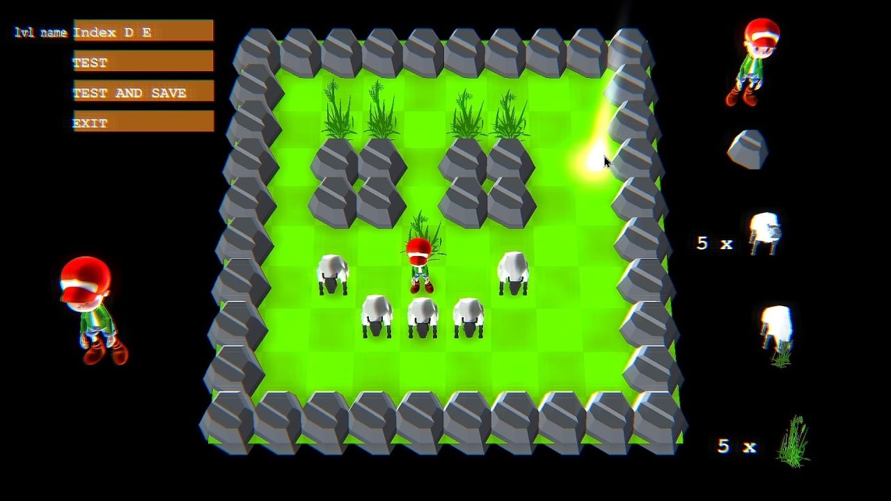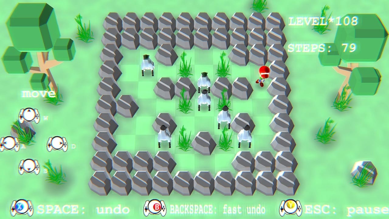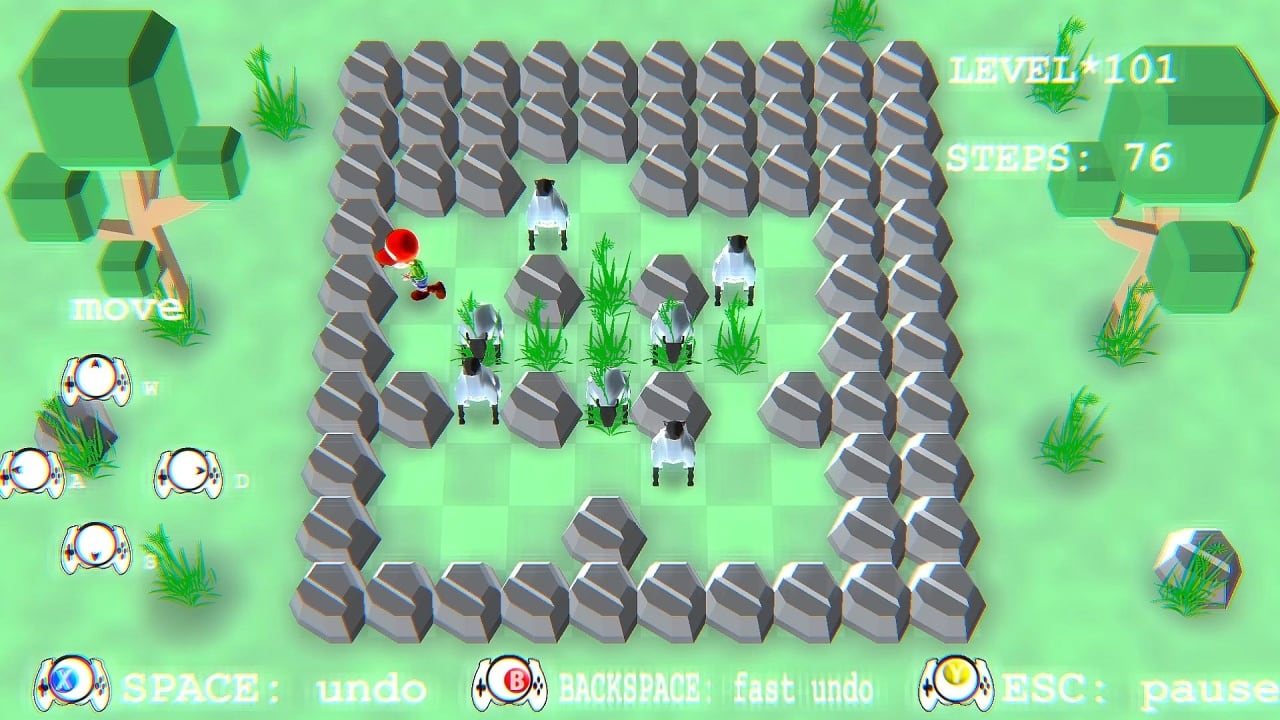 Push the Sheep дает возможность игрокам почувствовать себя пастухами. В этой видеоигре пользователи управляют мальчиком в красной кепке, что выпасает овец. Его животные голодают и не могут самостоятельно найти еду, пока та не окажется у них под носом. Поэтому юноше приходится помогать своему не очень смышленому стаду. У этого проекта трехмерная низкополигональная графика в мультяшном стиле. Камера расположена сверху и немного под углом таким образом, чтобы каждый этап умещался в пределах одного экрана. На нём отображается текущий уровень, коих тут больше сотни, количество сделанных ходов и подсказки с кнопками. Управлять героем можно при помощи клавиатуры или через геймпад.