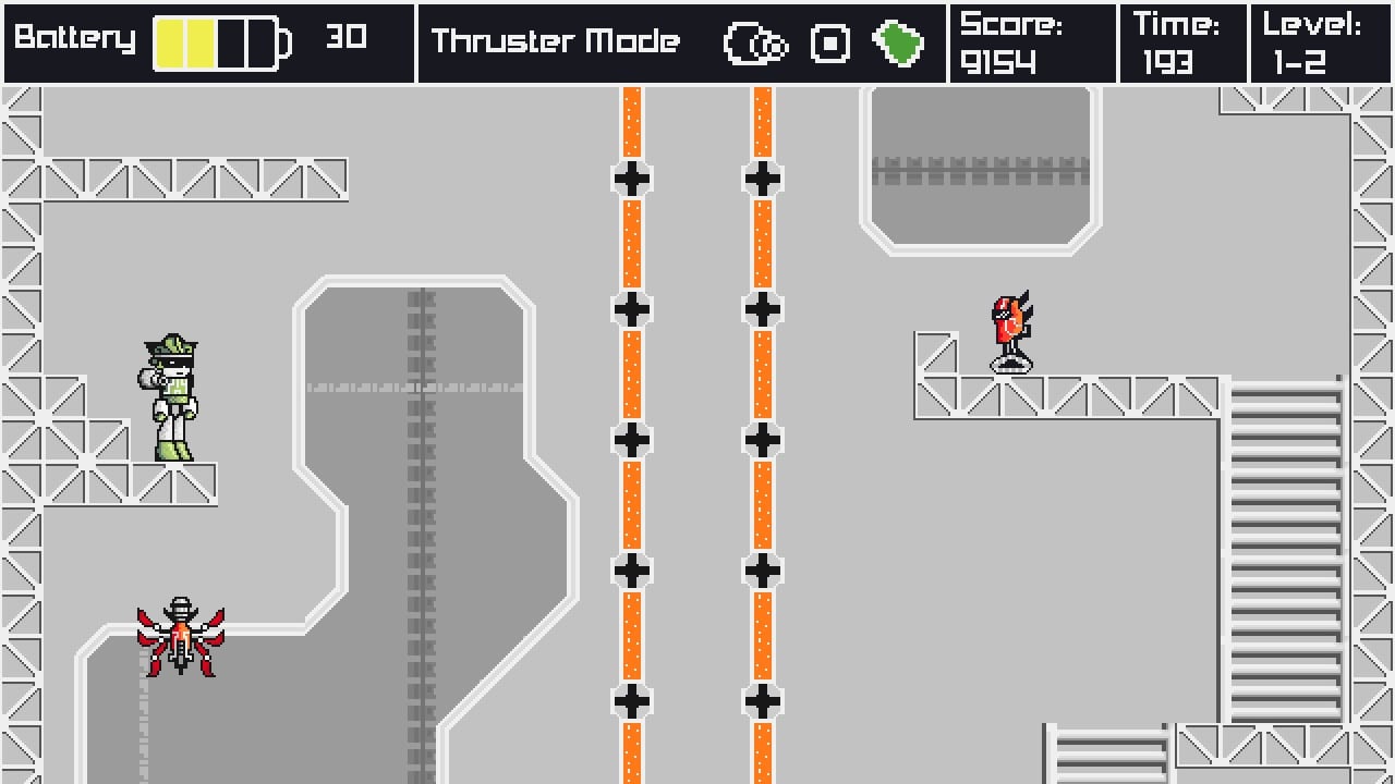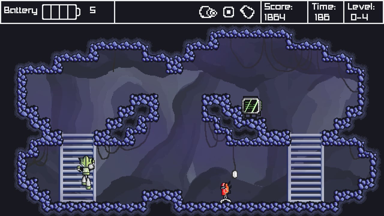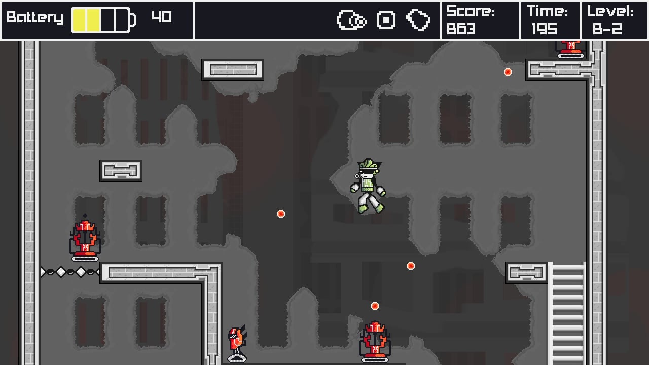 Battery-out – это платформер с видом сбоку и двухмерной пиксельной графикой. Он выделяется геймплеем, построенным вокруг необходимости распределять ресурсы. Управление героем осуществляется с клавиатуры. Юзеру дают под контроль киборга. У протагониста постоянно садится аккумулятор. Чтобы его восполнить, нужно искать на локациях батарейки. По умолчанию робот способен только ходить влево и вправо, а также прыгать. Он гибнет от любого касания об опасный объект, вражескую пулю или самого противника.
