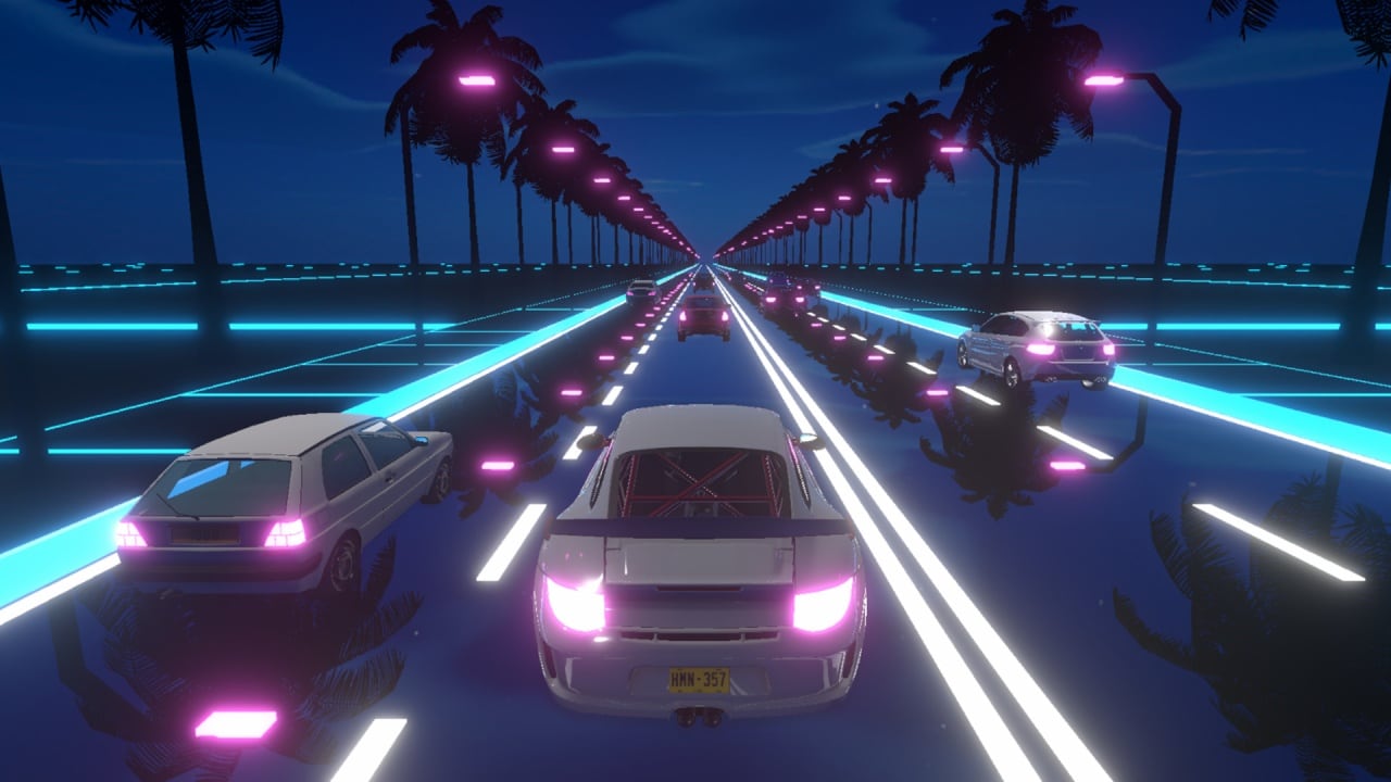 В игре Неоновый гонщик доступен только один ракурс. Камера находится за машиной и висит под углом. Инди-проект выполнен в стиле ретровейва. Вдоль дороги стоят пальмы и фонарные столбы с розовым светом. А сама поездка происходит по мокрому треку в темное время суток. Смысл каждого заезда состоит в том, чтобы проехать максимально возможную дистанцию и заработать как можно больше очков. Они тут служат внутриигровой валютой. На неё можно покупать транспортные средства. Они стоят дорого, поэтому геймплей построен на гринде. Автопарк насчитывает 10 тачек. Модели различаются дизайном, максимально возможным разгоном и скоростью смены полосы. Все доступные геймеру машины серебристого цвета. Тачки с другой расцветкой находятся под управлением искусственного интеллекта.