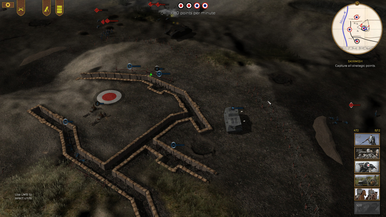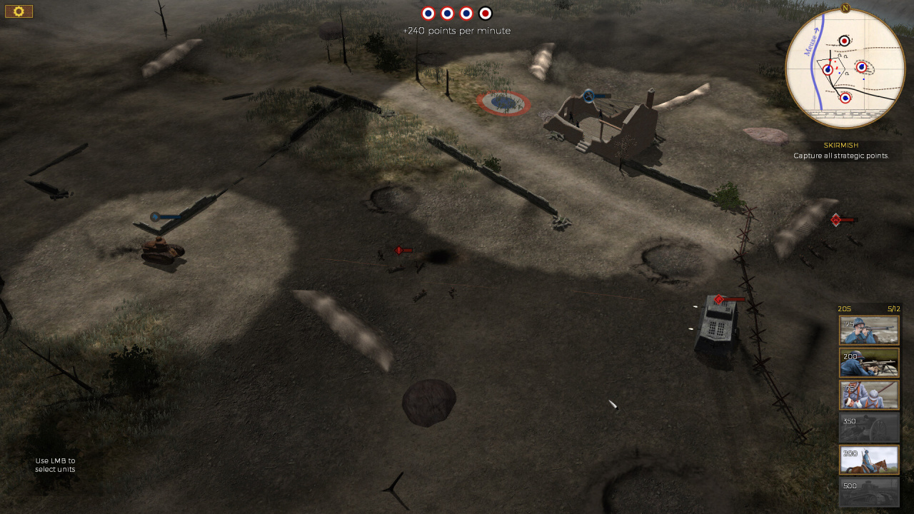 Поскольку это реалтаймовая тактика, а не классическая RTS, здесь нет возможности добывать ресурсы, отстраивать базу и создавать войска. В Tactics of World War I приходится беречь технику и бойцов, потому что восполнять бесконечно потери не получится. Чтобы минимизировать потери, необходимо совершать фланговые маневры, прикрывать пехоту, вести подавляющий огонь, прятать бойцов в окопах или за другими укрытиями и прибегать к различным хитростям. В инди-стратегии доступно более дюжины юнитов: самые первые танки, пулеметчики, конница, минометчики и так далее. У каждой фракции они свои. Пользователь получает 8 отрядов перед началом боя и распределяет их. 6 из них могут сразу вступить в бой, а 2 оставшихся будут числиться в резерве.