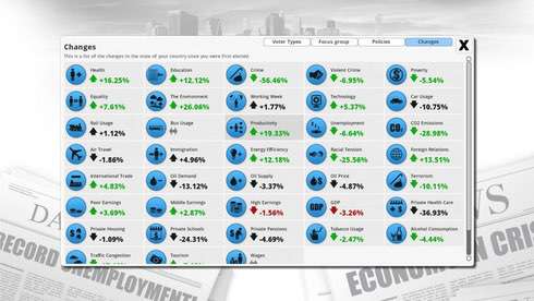 Доступно ведение 7 политик своего государства – общественных, правовых, транспортных, обеспечительных, экономических, налоговых и внешних. Нужно постоянно балансировать на краю пропасти, не забывая ни про одну сферу жизни будущих избирателей. Их мнение очень важно, ведь целью есть переизбрание на следующих президентских или парламентских выборах. Если электорат будет недоволен вашим правлением, вы уступите другому кандидату, что приведёт к концу прохождения.
