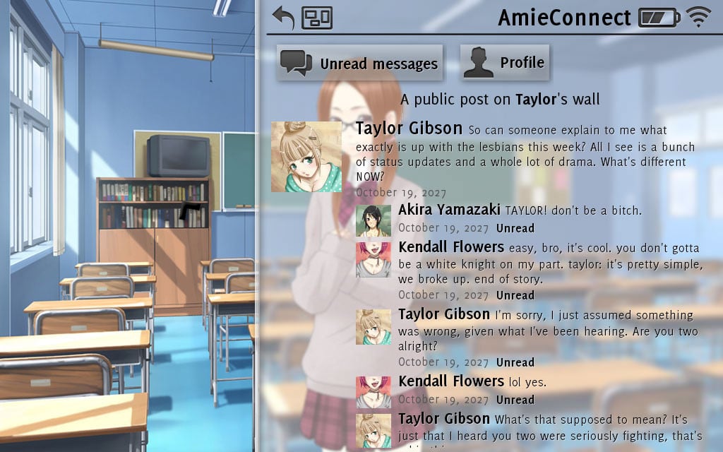 Don't take it personally, babe, it just ain't your story v 1.1 Новая версия Полная версия Последняя Дата выхода 2011 Разработчик Christine Love Жанр Аниме, Визуальная новелла Обновлено 19 мая 2025, 04:12 Список изменений Событие Don't take it personally, babe, it just ain't your story происходит в элитном учебном заведении в Онтарио в будущем. В центре сюжета находится Джон Рук, новый преподаватель литературы, жизнь которого в последнее время кардинально изменилась. Он пережил 2-ой развод, а, по собственным словам, он переживает кризис среднего возраста. Он решает бросить любимую работу в компьютерной сфере и устраивается на работу учителем литературы, поскольку желает новых эмоций от жизни. Внутри школы у каждого ученика в классе имеется собственный компьютер, благодаря которому они могут общаться между собой, пересылать сообщения и делать многое другое. Пообщавшись с администрацией учебного заведения, Рук получил указание следить за издевательствами в интернете. Он способен читать пересланные сообщения любого ученика, даже самые откровенные и личные, что поможет ему в выполнении его второстепенной работы. Игровой процесс представлен в виде визуальной новеллы в фантастическом сеттинге. Многие элементы в прохождении интерактивны, а также геймер получает возможность влиять на дальнейшую судьбу прохождения. Рассказ происходит благодаря говорящим персонажам на двухмерном фоне с наложенным на интерфейс текстом. Наблюдение за окружением происходит с видом от первого лица Джона Рука. Юзер получает уведомление каждый раз, когда создается текстовое сообщение от учеников, которое определяет дальнейший сюжет. Скачать торрент Скриншоты Видео из игры Скачать Don't take it personally, babe, it just ain't your story Тип релиза Лицензия (Таблетка: Не требуется) Версия v 1.1 (Полная) Последняя Размер 38.9 МБ Интерфейс Английский Озвучка Отсутствует Скачать .torrent торрент файл Скачать БЕЗ торрента прямая ссылка через uTorria Системные требования ОС: 2000 / XP / Vista / 7 / 8 / 10 Процессор: Pentium 3 600 MHz Оперативная память: 256 МБ Видеокарта: 128 МБ Место на диске: 55 МБ Нагота, Решения с последствиями