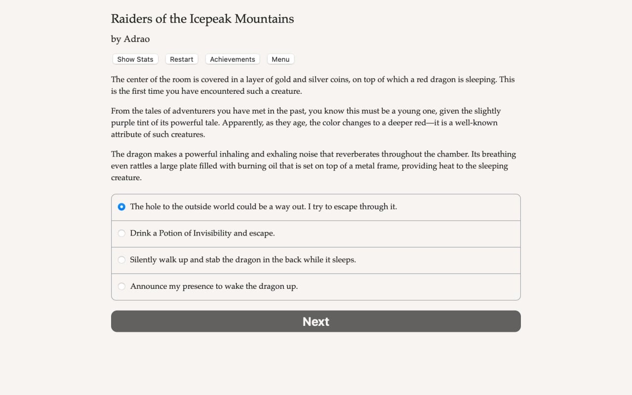 Raiders of the Icepeak Mountains Полная версия Последняя Дата выхода 12 ноя. 2021 Разработчик Hosted Games Жанр Экшены, Приключения, RPG, Инди Обновлено 26 января 2025, 13:25 Список изменений Raiders of the Icepeak Mountains выполнена в стилистике книги-игры. Здесь отсутствует классический геймплей ролевых игр или рогаликов - вместо этого пользователь читает текст, выбирает разные варианты действий и кидает кости. От сочетания этих факторов зависит, насколько удачным или провальным окажется решение. Сюжет Raiders of the Icepeak Mountains повествует о том, как орочьи племена начали угрожать соседним человеческим поселениям. Чтобы отвести опасность от соплеменников, протагонист отправляется в подземелья, где находится сердце орочьего альянса. При кастомизации персонажа геймер может выбрать один из 4 привычных классов - Воина, Волшебника, Священника или Плута. Каждый тип отличается своими преимуществами и недостатками. Например, Воин полагается на физические характеристики и владении оружием, Волшебник - на заклинания, а Плут отдает предпочтение скрытности. Чем выше характеристики героя, то тем больше вероятность успешного завершения броска. Пользователь также может сделать приключенца мужчиной, женщиной или кем-то иным. Однако, в игре полностью отсутствует возможность завязать с кем-либо отношения. Каждое путешествие в подземелье сильно отличается от предыдущего - протагониста будут ожидать новые ловушки и враги. У всех противников разные особенности и слабости. Также геймер может менять уровень сложности, делая прохождение легче или тяжелее. Скачать торрент Скриншоты Показать больше Скачать Raiders of the Icepeak Mountains Тип релиза Пиратка (Таблетка: Не требуется) Версия (Полная) Последняя Размер 82.88 МБ Интерфейс Английский Озвучка Отсутствует Скачать .torrent торрент файл Скачать БЕЗ торрента прямая ссылка через uTorria Системные требования ОС: Windows 7, 8, 10 Процессор: Dual Core 2.0 GHz Оперативная память: 4 ГБ Видеокарта: Intel HD 3000 Место на диске: 150 МБ Казуальная, Выбери себе приключение, Упрощённый рогалик, Фэнтези, Тёмное фэнтези, Кастомизация персонажа, Решения с последствиями, Бой, Несколько концовок, Глубокий сюжет