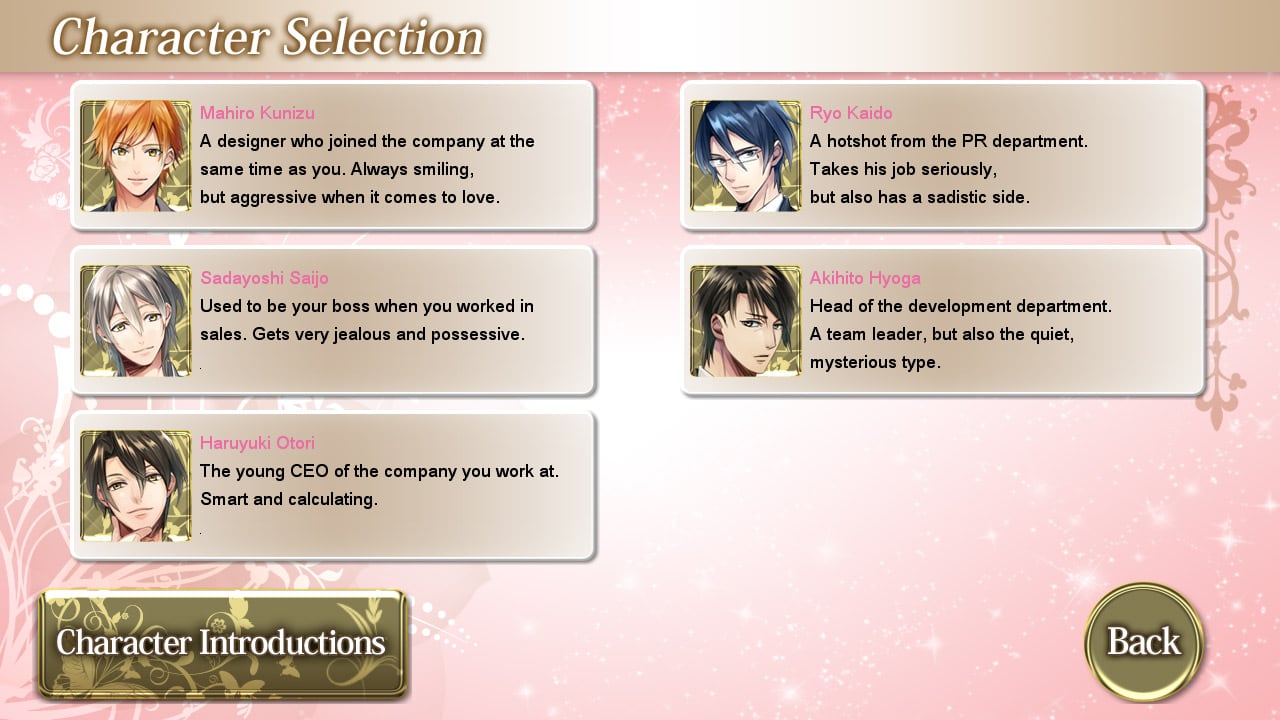 Office lovers Полная версия Последняя Дата выхода 7 авг. 2016 Разработчик Dogenzaka Lab Жанр Приключения, Визуальная новелла Смешанные на основе 119 обзоров в Steam 49% Обновлено 26 января 2025, 13:18 Список изменений Office lovers – это визуальная новелла для всех фанатов чистой романтики, где все сосредоточено на построении отношений с понравившимся персонажем. Пользователь сможет окунуться в офисную атмосферу, полную различных интриг, слухов и сплетен. После того как девушка вступит в отношения ей стоит ожидать различных завистливых недоброжелателей со стороны коллег. Главная героиня наконец-то получила желанную работу в престижной компании. Она успешно прошла все собеседования и этапы, благодаря чему теперь выходит на полноценную стажировку. Из-за нехватки качественных кадров ей почти сразу же поручают взяться за помощь над будущим Рождественским продуктом и предоставляют команду специалистов.Парни в Office lovers: Кунидзу – также новенький в офисных рядах, добрый, улыбчивый и открытый, отвечает за дизайн текущего проекта, а также его творческое оформление, порой его фантазию стоит немного притормаживать Кайдо – работает в отделе по делам с общественностью, многие считают его невероятно горячим, но вступать в отношения не спешат, так как парень известен садистскими наклонностями Сайдзё – бывший начальник героини, теперь находится здесь же в отделе продаж, невероятный собственник и ревнивец, не допускающий конкуренции Хёга – глава команды, а также отдела разработки, немного тихий и замкнутый, но довольно загадочный, его личность сполна раскрывается только при тесном контакте Отори – молодой генеральный директор, пробился на данную должность благодаря своему расчетливому уму и хитрости, также ведет себя и в любовных делах В данной игре присутствуют также сцены, подходящие для взрослой аудитории. Путь с каждым из любовных интересов абсолютно уникальный и обладает своими неожиданными поворотами и дополнительными изображениями. Все они после прохождения будут помещены в галерею для повторного просмотра в более высоком разрешении. Скачать торрент Скриншоты Показать больше Видео из игры Скачать Office lovers Тип релиза Пиратка (Таблетка: Вшита) Версия (Полная) Последняя Размер 484.4 МБ Интерфейс Английский Озвучка Отсутствует Установка: Скачать .torrent торрент файл Скачать БЕЗ торрента прямая ссылка через uTorria Системные требования ОС: Windows 7, 8, 10 Процессор: Intel Pentium IV 1,8GHz Оперативная память: 1 ГБ Видеокарта: Intel HD 3000 Место на диске: 500 МБ