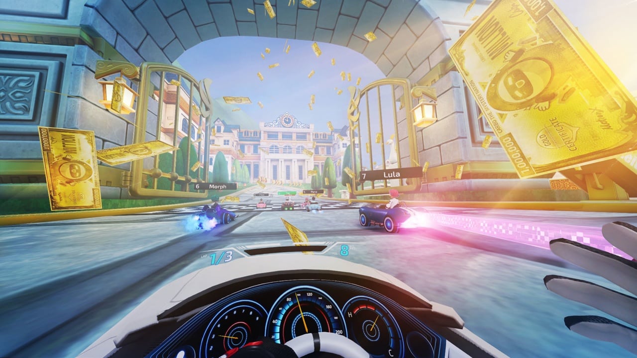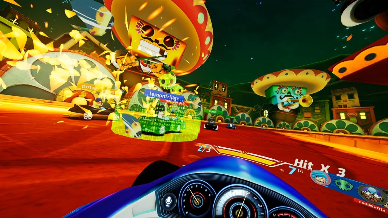 Dash Dash World – это аркадные боевые гонки с видом от первого лица. Видеоигра ориентирована на владельцев VR-устройств. Она содержит в себе 6 разных опций, помогающих избежать укачивания в шлеме виртуальной реальности. Ещё тут разрешают менять схемы управления. Играть можно стоя или сидя. В этой гоночной аркаде поединки происходят немного не так, как в других подобных проектах. Здесь каждый юзер кладет одну конечность на руль, а второй берет оружие ближнего или дальнего боя. При стрельбе надо вручную целиться, а для проведения атак вблизи – самостоятельно размахивать предметом. Есть автоматы, пулеметы, гранаты, сковородки, пистолеты-пулеметы и другие вещи. Можно ненадолго отпустить баранку, чтобы держать по пушке в каждой руке и вести огонь по конкурентам.