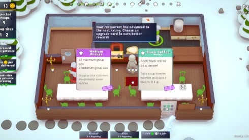 Играя в команде, требуется разделять обязанности. Кто-то должен нарезать продукты, другой участник заниматься готовкой, третий сервировкой и подачей. Четвертый может помогать кому-то из других участников или же заниматься мытьем посуды, которой может быть огромное количество. Сложность постоянно увеличивается и перед участниками ставятся разные цели. Доступна штаб-квартира, отображающая достижения созданной франшизы.