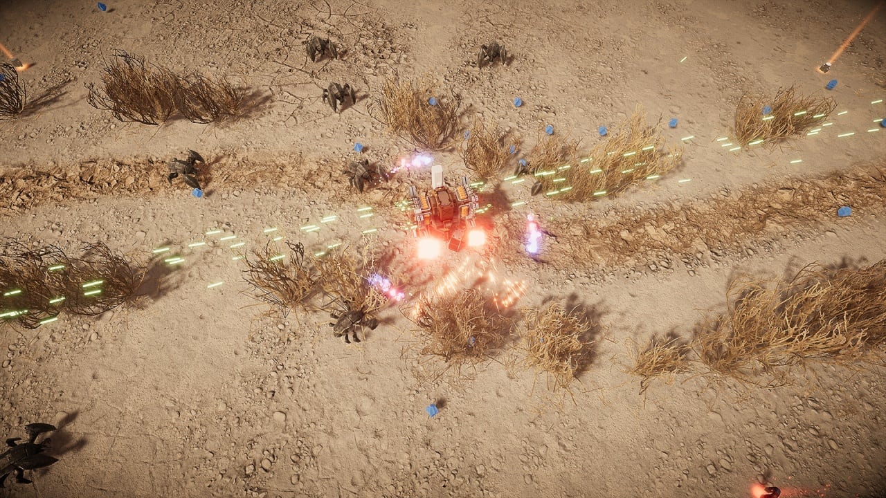 Проект Лазарь является духовным наследником нашумевшей игры Vampire Survivors. Здесь мех тоже самостоятельно выбирает себе цели и стреляет в противников автоматически. Задача пользователя – перемещать робота по локации, уклоняться от атакующих вблизи врагов, собирать выпадающие из супостатов сферы опыта и строить билды. В видеоигре есть более 15 разновидностей оружия. Геймер сам решает, какие пушки устанавливать на боевой транспорт. Помимо этого он может улучшать эти стволы. Также присутствует прокачка. При сборе достаточного количества экспы повышается уровень. В такое моменты игроку предлагают выбрать один из 3 случайно выбранных апгрейдов. При желании можно пропустить этот шаг или попытаться зарероллить более подходящие улучшения, чтобы не ломать билд из-за рандома.