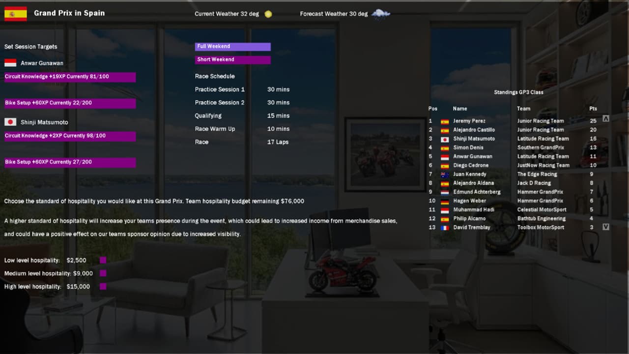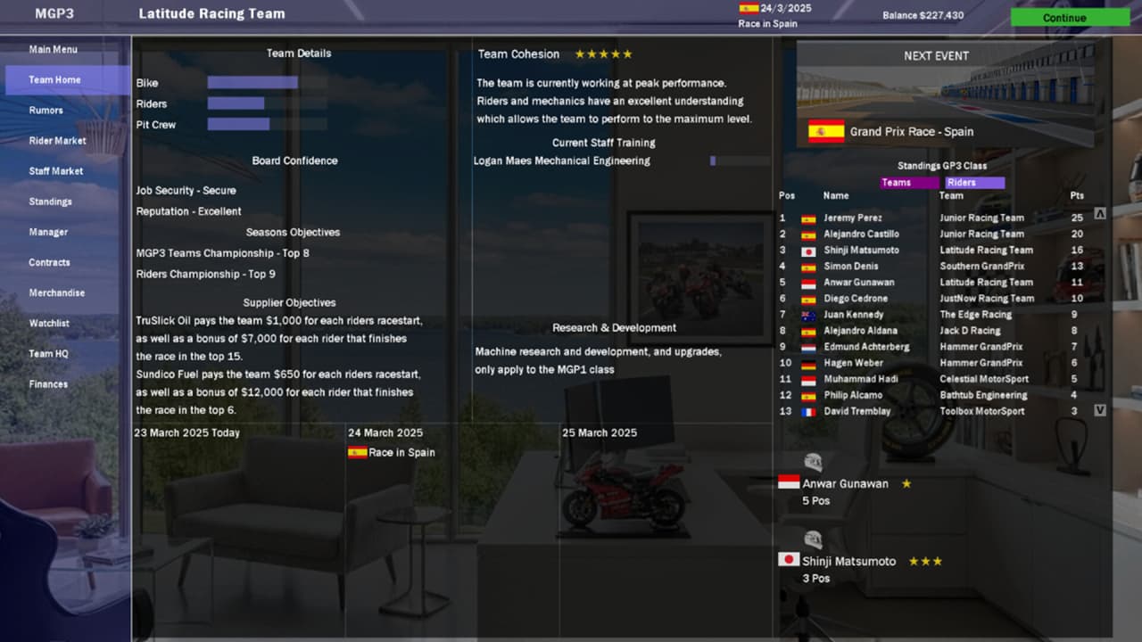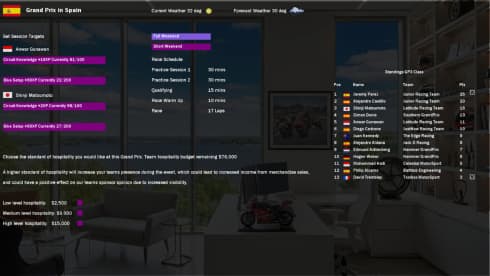 MGP Manager - симулятор, позволяющий стать менеджером мотогоночной команды. Потребуется заниматься всеми закулисными и финансовыми вопросами. Требуется покупать транспорт, заниматься их прокачкой и улучшениями, нанимать механиков, подписывать контракты с пилотами и многое другое. На заезды влияет множество разных факторов: температура воздуха, погода, количество пит-стопов, травмы гонщиков и многое другое. Все это необходимо учитывать при следующей гонке. В MGP Manager 19 уникальных трасс, 11 команд и более 20 профессиональных водителей. Доступно более 120 сотрудников, которых можно нанять в команду.