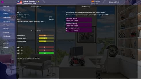 Перед чемпионатами можно потренировать гонщиков на специальных трассах. Будучи менеджером требуется следить как за тренировками, так и финансовыми отчетами. Тестовые заезды должны проходить раз в несколько дней по 6 часов. Очень важно сделать так, чтобы пит-стоп специалисты были подготовлены к любым сложностям и работали максимально слаженно. События генерируются рандомным методом.