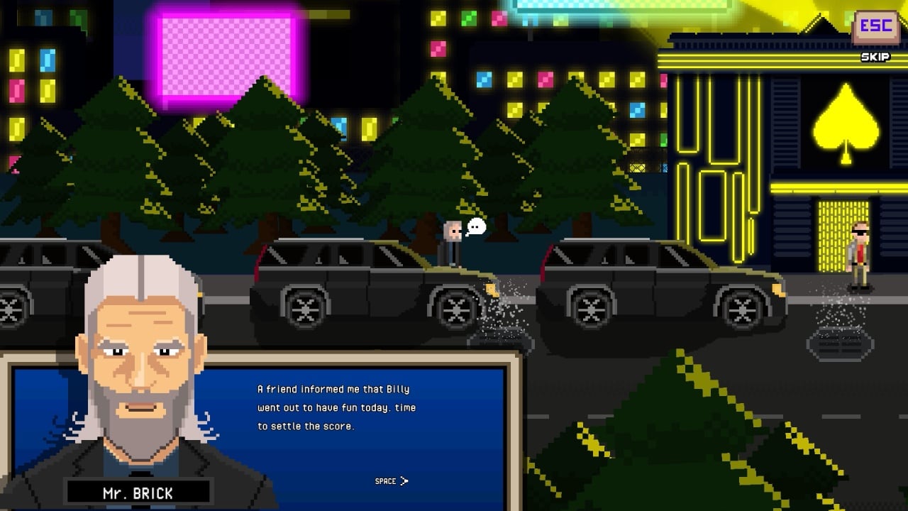 Также здесь есть эпизоды с поездкой на машине, где надо перестраиваться между полосами шоссе и вести огонь из транспорта. Джон Брик – это название видеоигры и имя протагониста. Сюжет пародирует фильмы про Джона Уика и изобилует множеством отсылок к поп-культуре и другим играм. Завязка истории похожа на оригинал. Бывший киллер по кличке Boogeyman остепенился и решил начать спокойную жизнь. Однако случайный бандит выстрелил в его любимого пса и угнал его тачку. Испугавшись мести, босс этого преступника направил в дом протагониста головорезов. Однако антигерой выжил и отправился в небольшое путешествие, чтобы расквитаться с обидчиками. История подается в формате восьмибитных заставок.