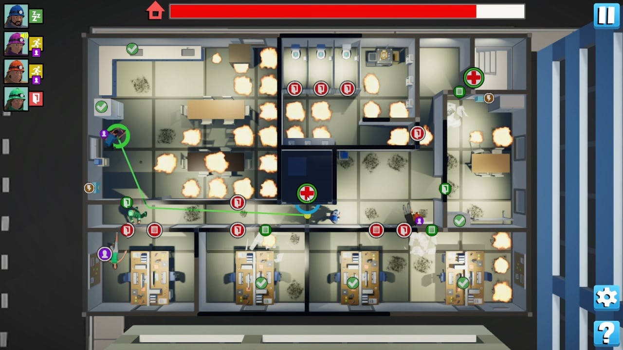 В видеоигре Пожарная команда все события разворачиваются внутри построек. Всего есть 3 типа зданий. Для прохождения этапа нужно освобождать путь к выходу, искать и эвакуировать выживших людей, а также не дать пламени распространиться до критической отметки. Надо успеть всё сделать до того, как дом рухнет. Пользователи могут приказывать пожарным ходить, тушить огонь, выламывать двери, тащить раненых и всё в таком духе. В перерывах между миссиями игрокам разрешают прокачивать своих подопечных. Они получают на выбор одно из нескольких улучшений. Каждый апгрейд влияет сразу на всех членов отряда. Можно повысить им скорость передвижения, увеличить грузоподъемность и так далее.